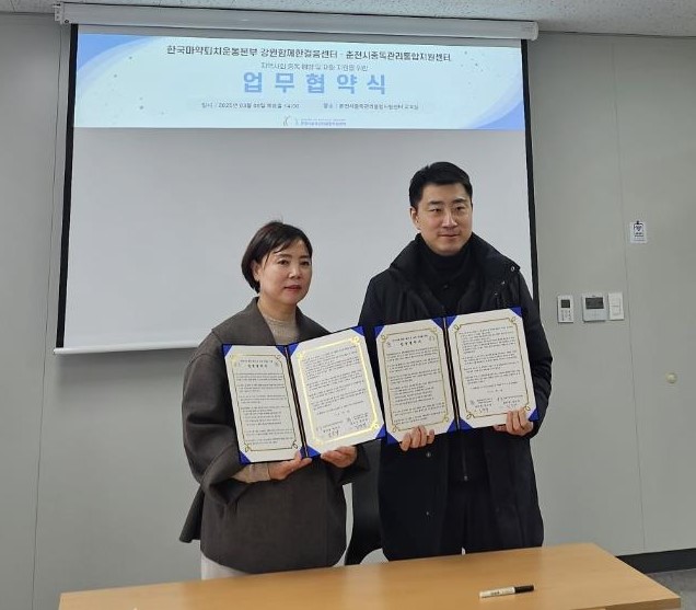 춘천시중독관리통합지원센터(센터장 정숙자)와 한국마약퇴치운동본부 강원함께한걸음센터(센터장 임규성)는 3월 6일 지역 내 약물중독문제의 회복과 건강한 지역문화 조성 및 건강증진을 위해 업무협약을 맺었다. 이번 업무협약으로 양 기관은 지역사회 약물(마약)로부터 어려움을 겪는 대상자의 재활과 사회복귀를 돕기 위해...