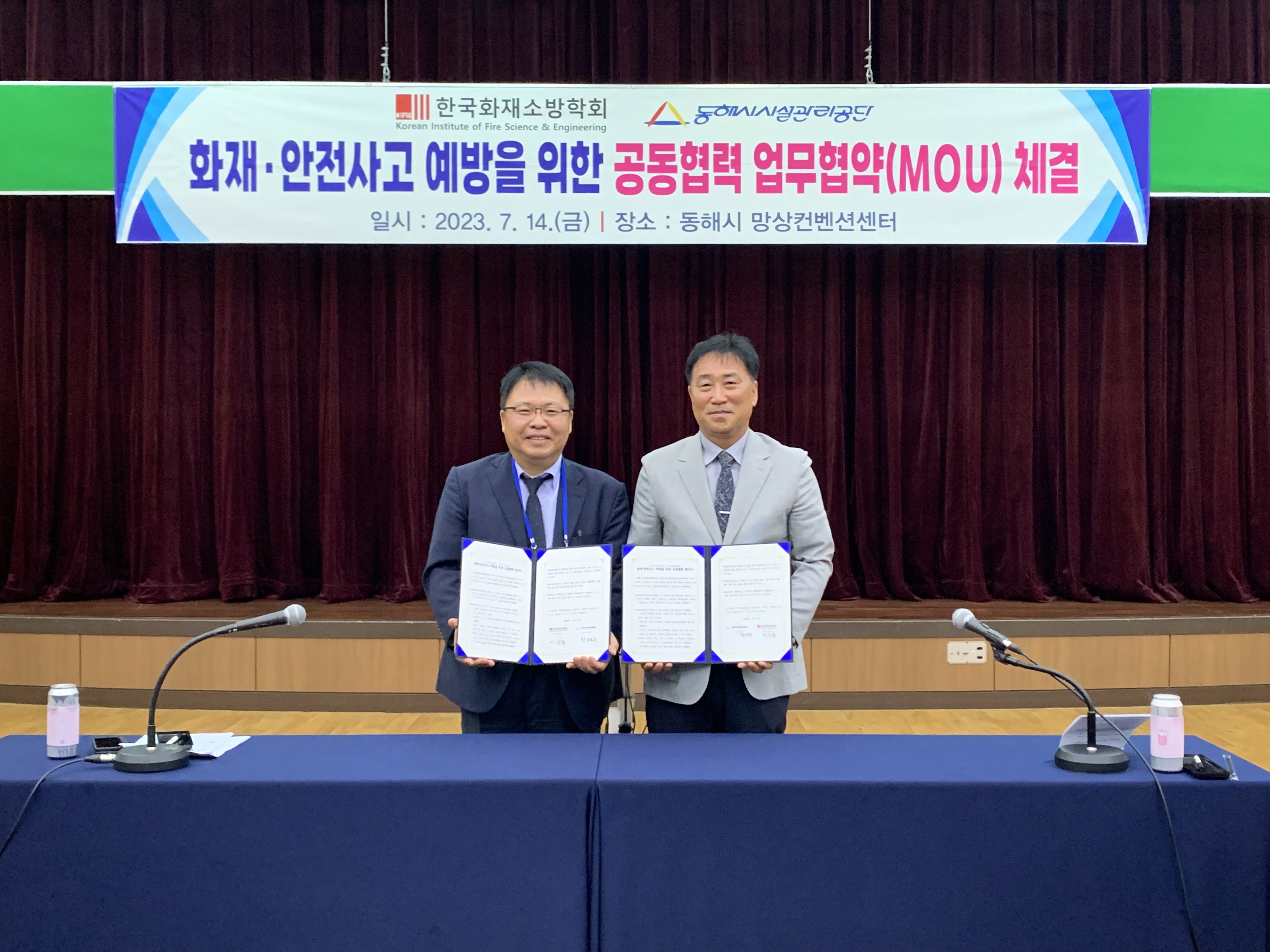 [강원사회복지신문 이정환 기자]=동해시시설관리공단-한국화재소방학회 공동협력 협약식 개최 동해시 시설관리공단(이사장 장해주)이 화재 및 안전사고 예방에 드라이브를 걸었다. 지난 7월 14일 망상컨벤션센터 대회의실에서 장해주 동해시시설관리공단 이사장과 이승철 한국화재소방학회 학회장, 공단 임직원 및 학회 임원...