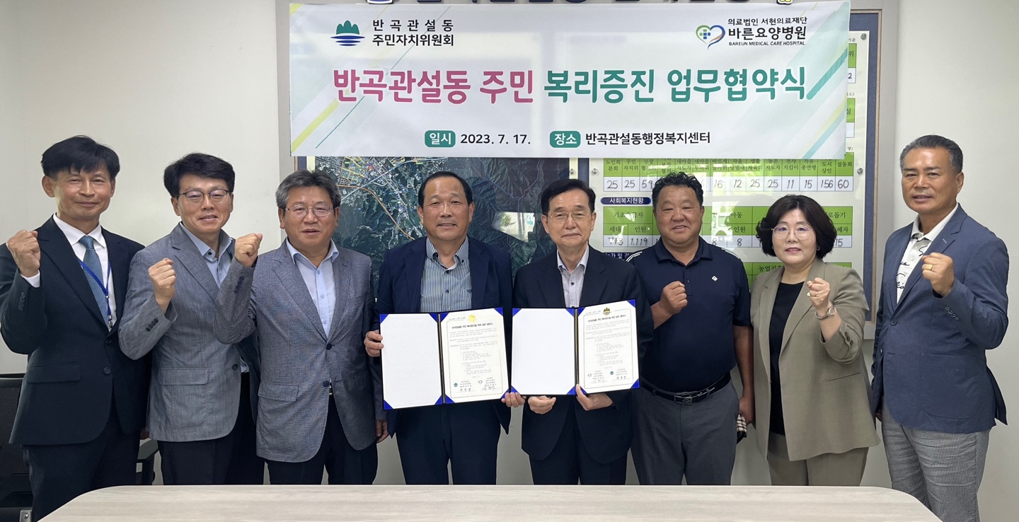 [강원사회복지신문 이정환 기자]=원주시 반곡관설동 주민자치위원회(위원장 원민영)는 지난 7월 17일 의료법인 서현의료재단 바른요양병원(원장 유병욱)과 업무협약을 체결했다. 판부면에 위치하고 있는 바른요양병원은 이번 협약으로 반곡관설동 주민들에게 각종 할인 혜택을 포함한 양질의 의료서비스를 제공하기로 했다. ...