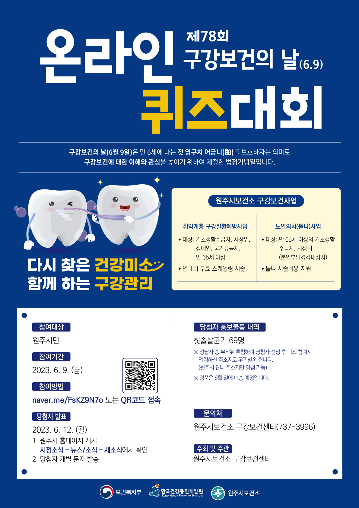 [강원사회복지신문 김도연 기자]=원주시보건소 구강보건센터는 지난 6월 9일 구강보건의 날을 맞아 원주시민을 대상으로 온라인 퀴즈 행사를 진행한다. 첫 영구치가 나오는 6세의 '6'과 영구치(어금니)의 '구'를 딴 6월 9일 '구강보건의 날'은 지난 2016년 법정기념일로 제정됐다. 원주시 보건소 구강보건센터는 구강보건에 ...