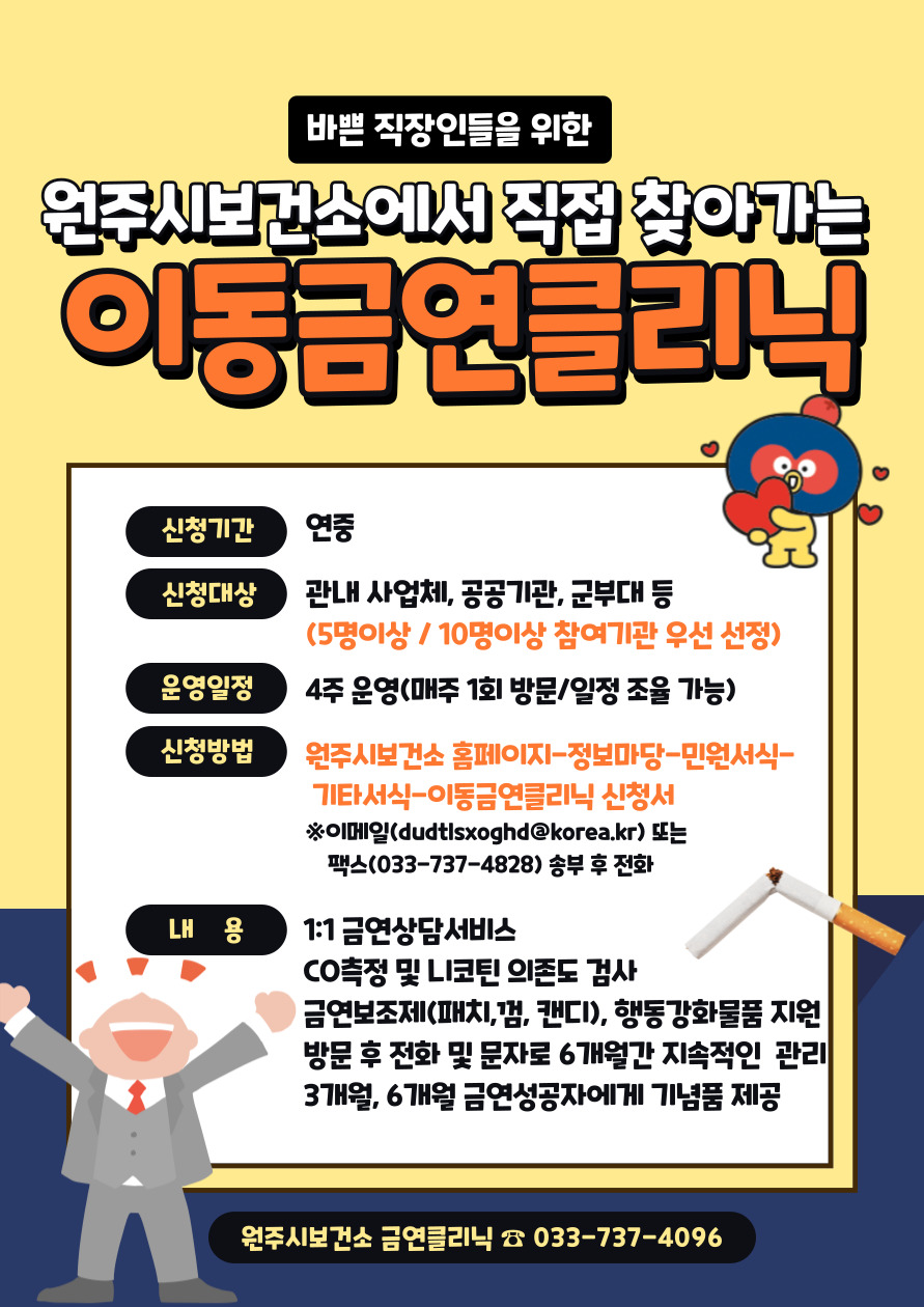 [강원사회복지신문 서은진 기자]=5명 이상 금연 희망자가 있는 사업장 등 대상 전문 금연상담사가 1:1 맞춤 금연 상담서비스를 제공 6개월 금연 성공 시 5만 원 상당의 상품권 지급 원주시보건소는 관내 사업장, 공공기관, 군부대 등을 대상으로 찾아가는 이동금연클리닉을 운영하고 있다. 이동금연클리닉은 시간적, 환경적 ...
