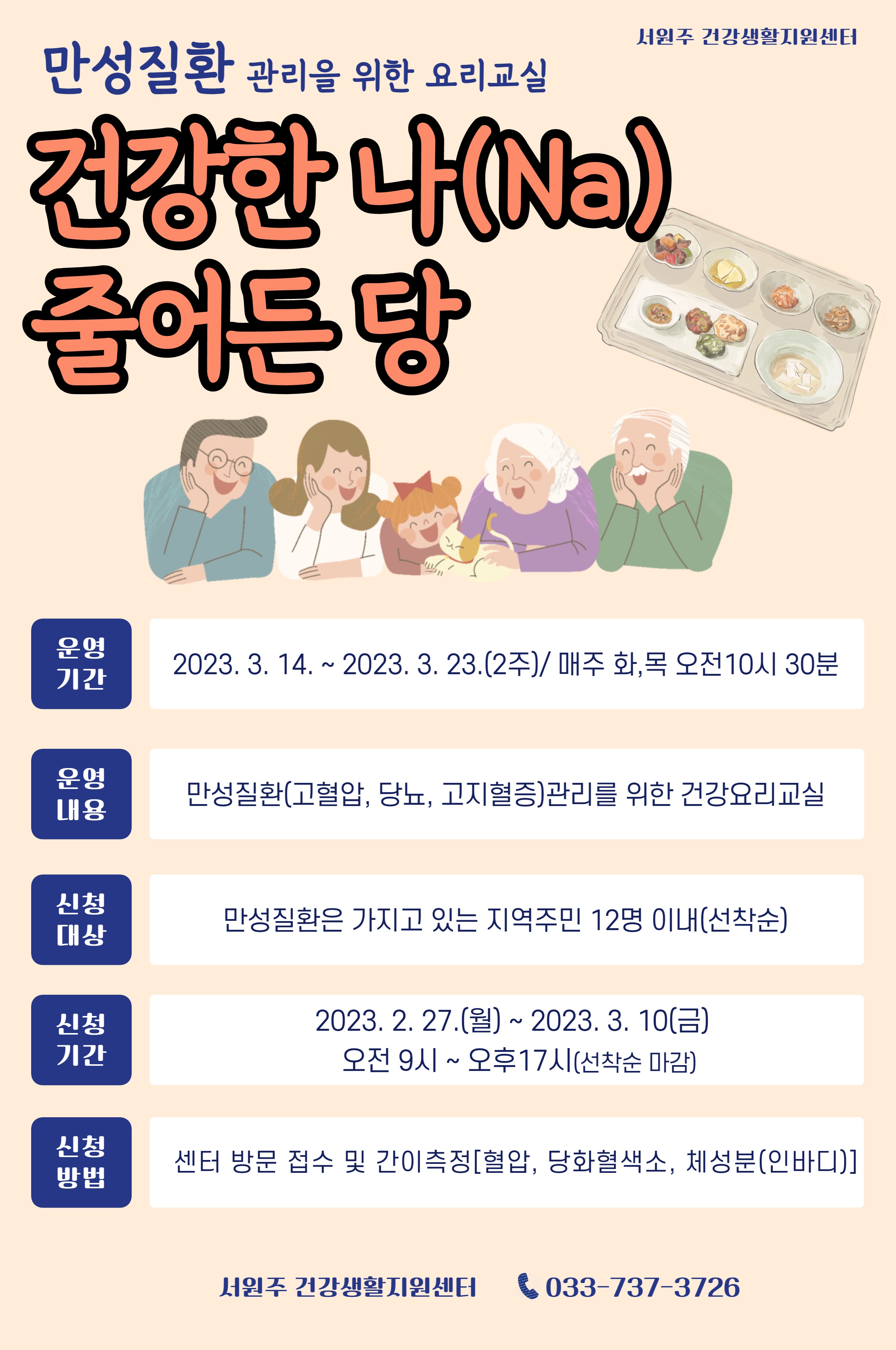 [강원사회복지신문 김도연 기자]=오는 3월 10일까지 선착순 12명 모집 기업도시 내 서원주 건강생활지원센터는 오는 3월 14일부터 23일까지 지역주민의 만성질환 관리를 위한 1기 요리 교실 '건강한 나(Na) 줄어든 당'을 운영한다. 이번 요리 교실은 올바른 식이요법 교육과 저염·저당 건강 조리 실습을 통한 건강한 식습관...