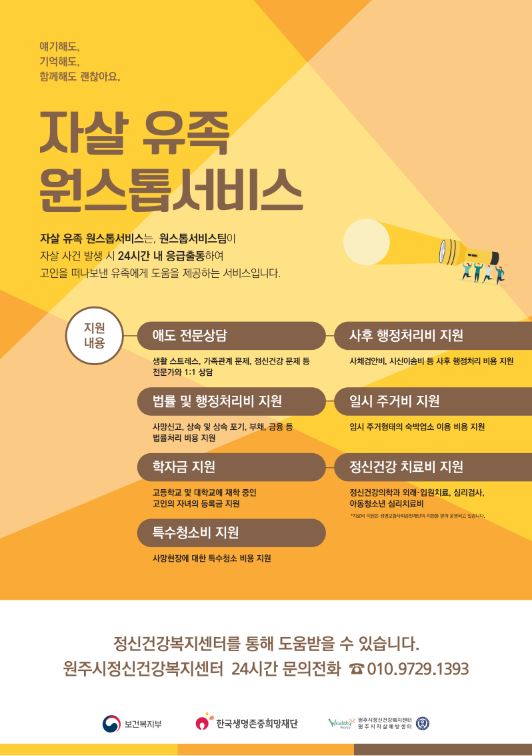 [강원사회복지신문 이정환 기자]=자살 사건 발생 시 24시간 내 응급출동, 유족에게 다양한 서비스 지원 오는 7월부터 서울, 대구 등 6개 광역자치단체로 확대 예정 원주시정신건강복지센터(센터장 민성호) 부설 원주시자살예방센터는 자살 사건 발생 시 24시간 내 전담팀이 응급출동해 유족에게 도움을 제공하는 '자살 유족 ...