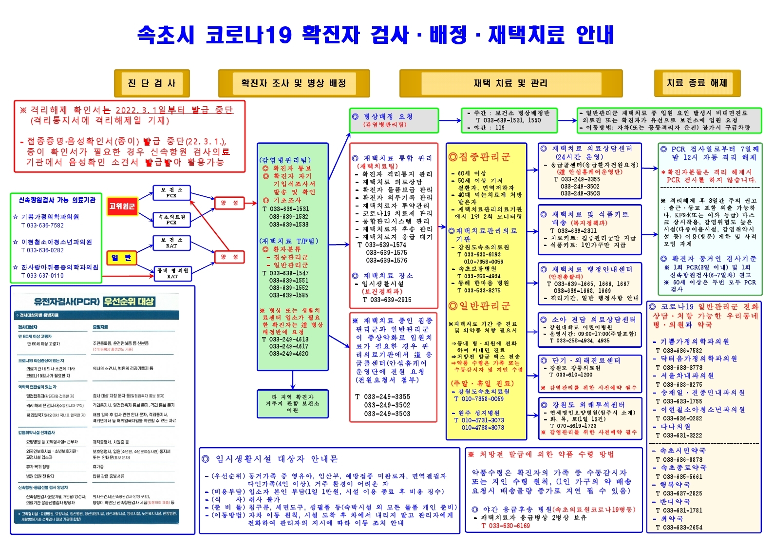 [강원사회복지신문 서은진 기자]=오미크론의 대유행으로 재택치료자가 폭증하는 가운데 속초시에서는 확진자의 안정적 관리와 민원 행정의 효율성 제고를 위해 '속초시 코로나19 검사·배정·재택치료 안내도'를 제작·배포하여 코로나19에 유연하게 대응하고 있다. 재택치료 가정과 코로나19 관리·연계 기관 모두 정보를 공...