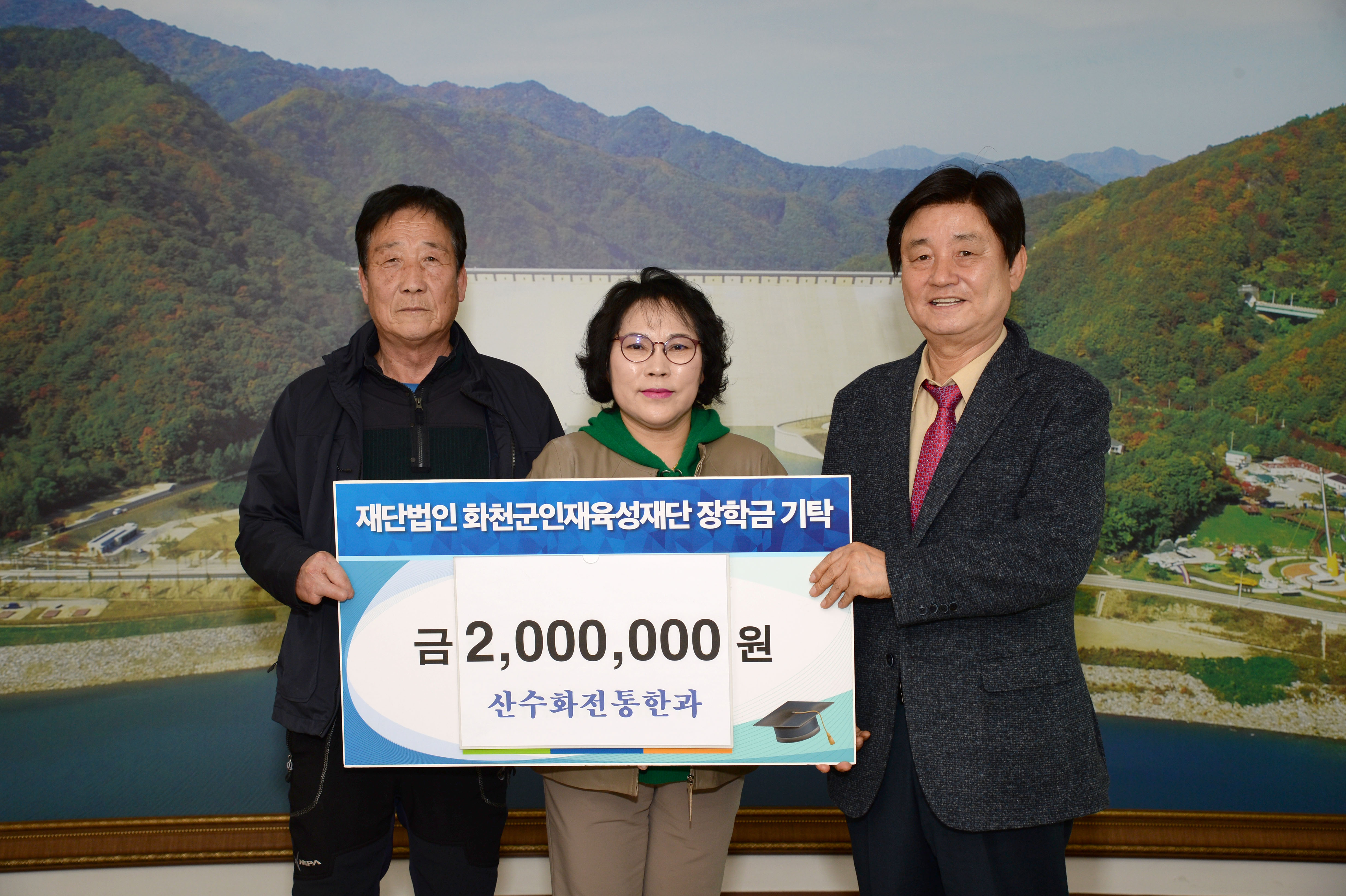 [강원사회복지신문 홍기한 기자]=산수화 전통한과(대표:김정옥)는 지난 3월 2일 최문순 화천군 인재육성재단 이사장을 방문해 장학금 200만원을 기탁했다.