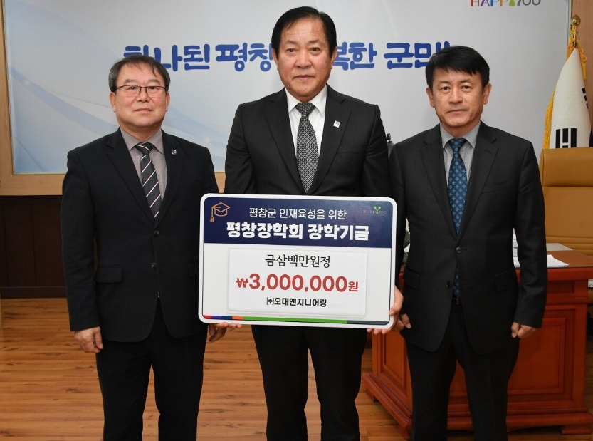 [강원사회복지신문 김종한 기자]=(주)오대엔지니어링(대표 김찬수)는 지난 2월 23일 평창장학회에 장학기금 300만원을 기탁하였다.
