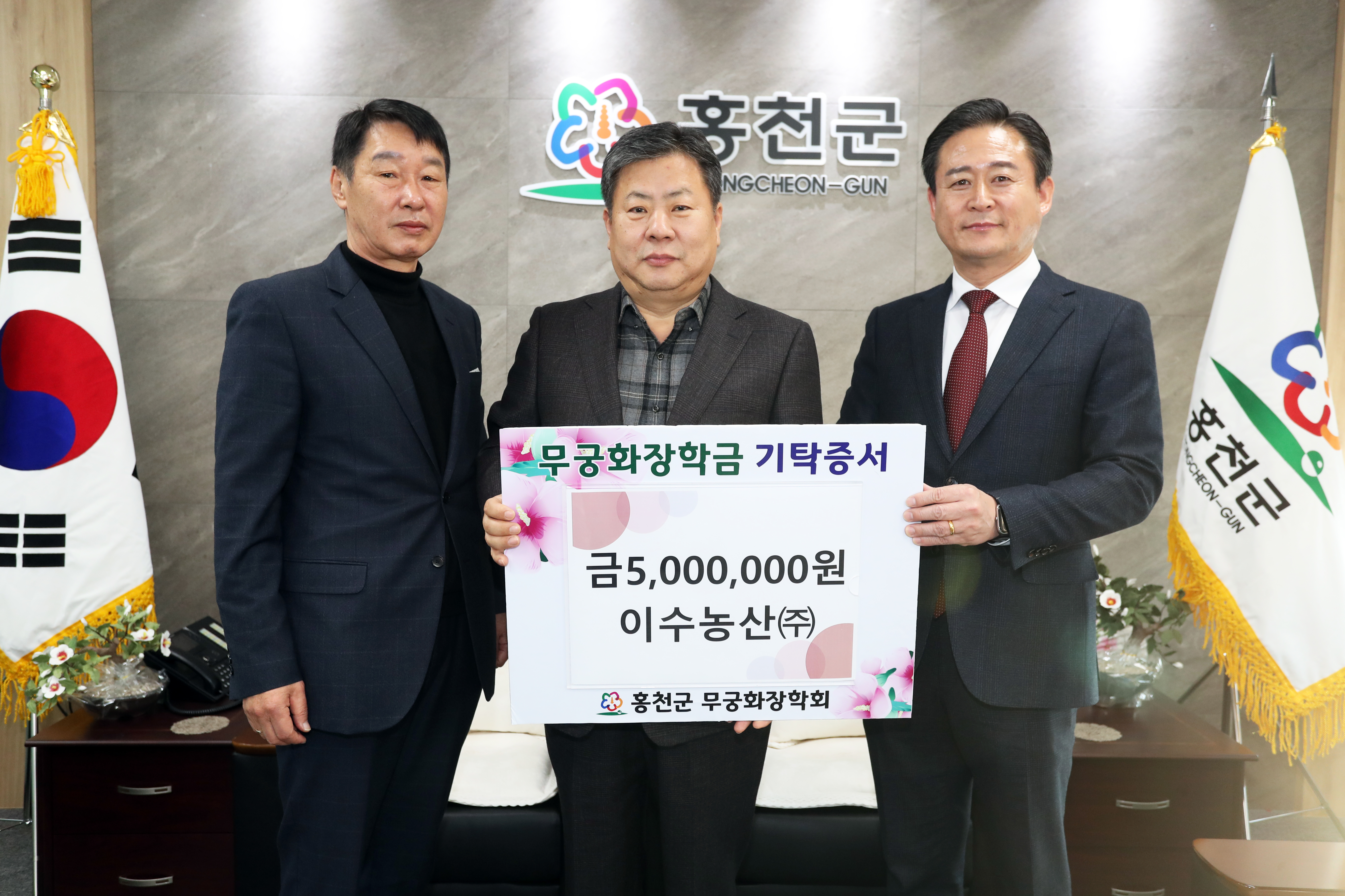 [강원사회복지신문 서은진 기자]=이수농산(주)(대표 음수연)은 지난 2월 23일 홍천군청을 방문해 인재육성을 위한 무궁화장학금 500만원을 기탁했다.
