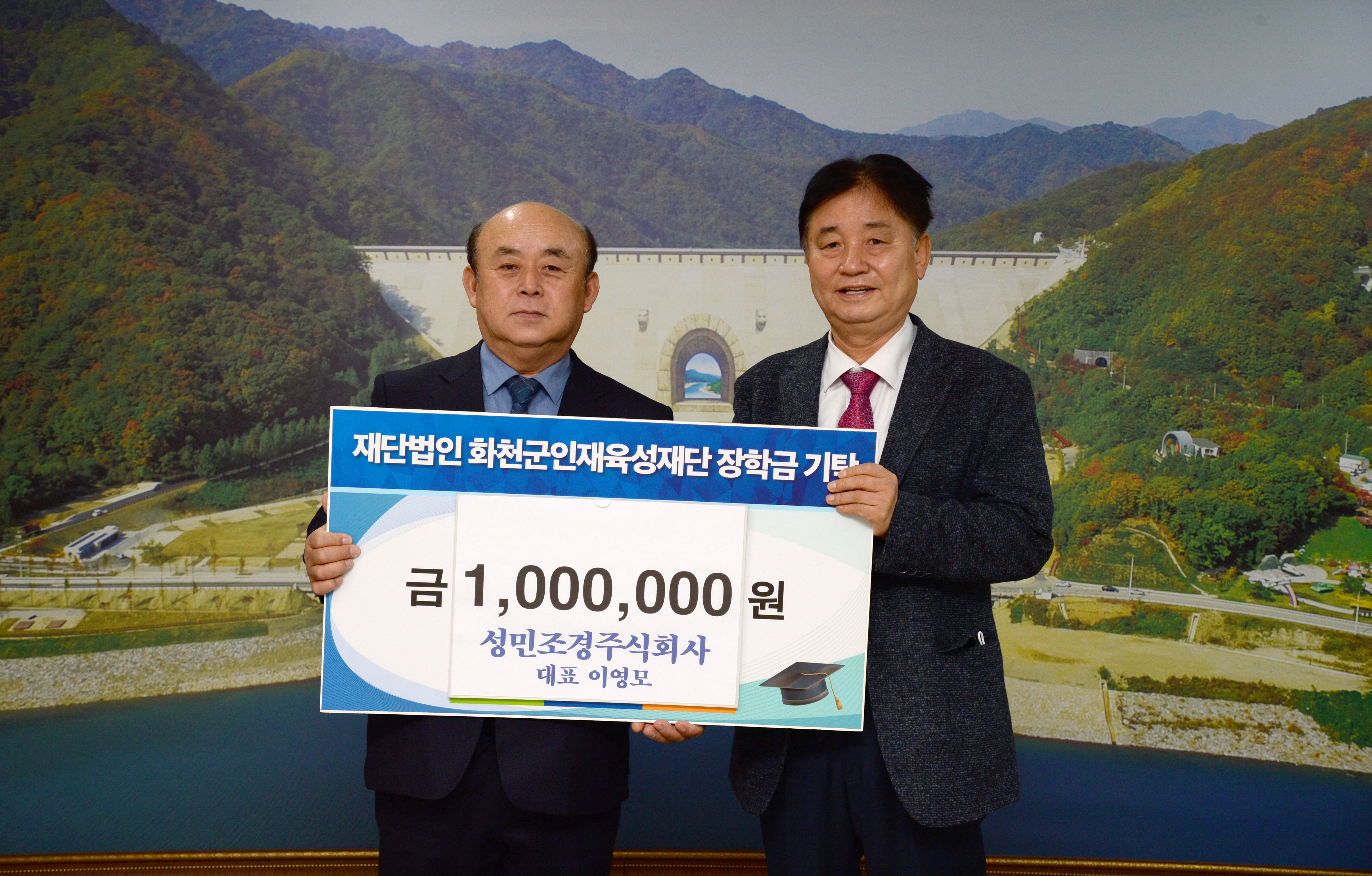 [강원사회복지신문 서은진 기자]=이영모 성민조경 주식회사 대표는 지난 2월 13일 최문순 화천군 인재육성재단 이사장을 방문해 장학금 100만원을 기탁했다.