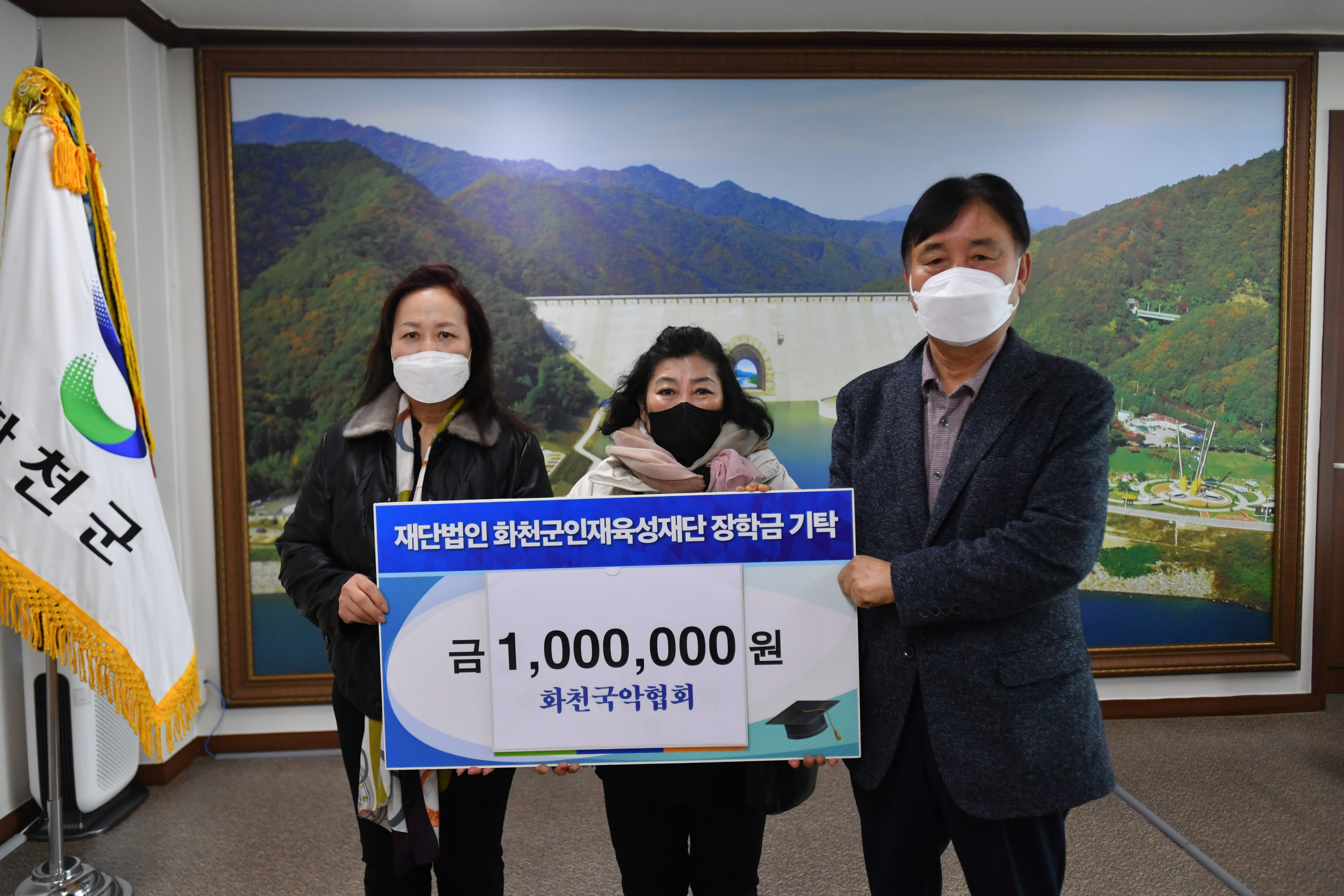 [강원사회복지신문 이정환 기자]=화천국악협회(회장:원명해)은 지난 2월 15일 최문순 화천군 인재육성재단 이사장에게 장학금 100만원을 기탁했다.