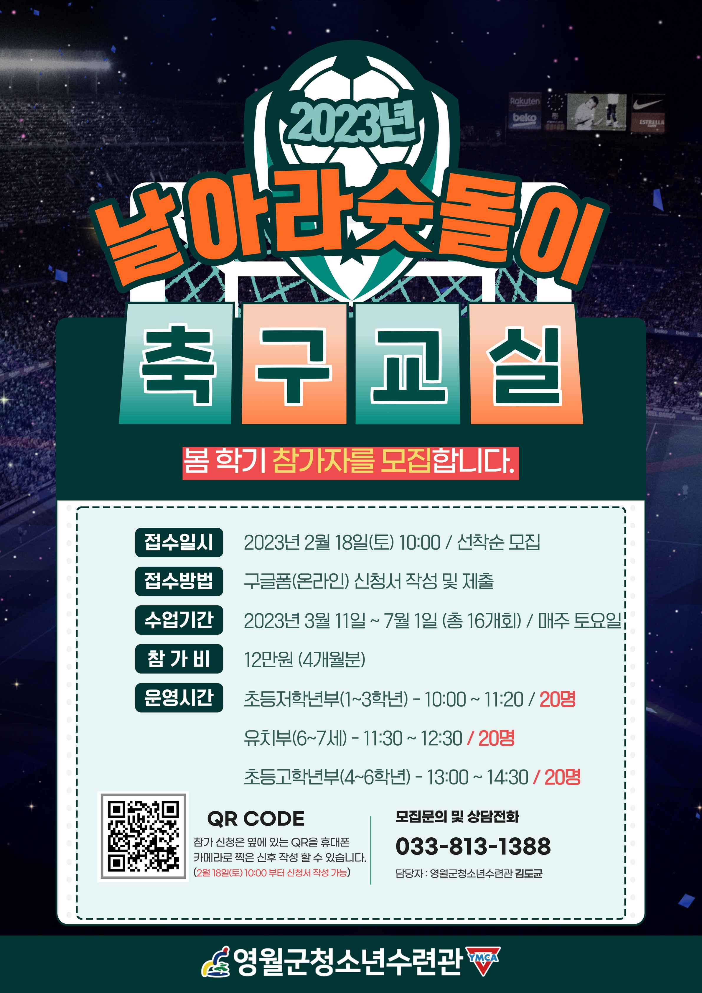 [강원사회복지신문 홍기한 기자]=영월군청소년수련관(이두영 관장)은 생활체육 활성화 및 유소년들의 신체단련, 사회성, 협동심 함양 기회를 제공하기 위해 영월군 유일 주말 축구 청소년활동프로그램인 ‘2023년 날아라 슛돌이 축구교실’을 운영한다. 올해 날아라 슛돌이 축구교실 프로그램은 영월군 관내 6세~13세 유소년...