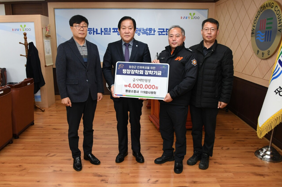 [강원사회복지신문 김종한 기자]=평창소방서 119참사랑회(회장 신승은)는 지난 2월 1일 지역 내 인재육성을 위해 사용해 달라며 평창장학회에 장학기금 400만원을 기탁하였다. 119참사랑회는 2012년 구성되었으며, 평창소방서 직원들이 매월 회비를 모아 어려운 이웃돕기, 코로나19 예방 마스크 기탁, 장학기금 기탁 등 선행...