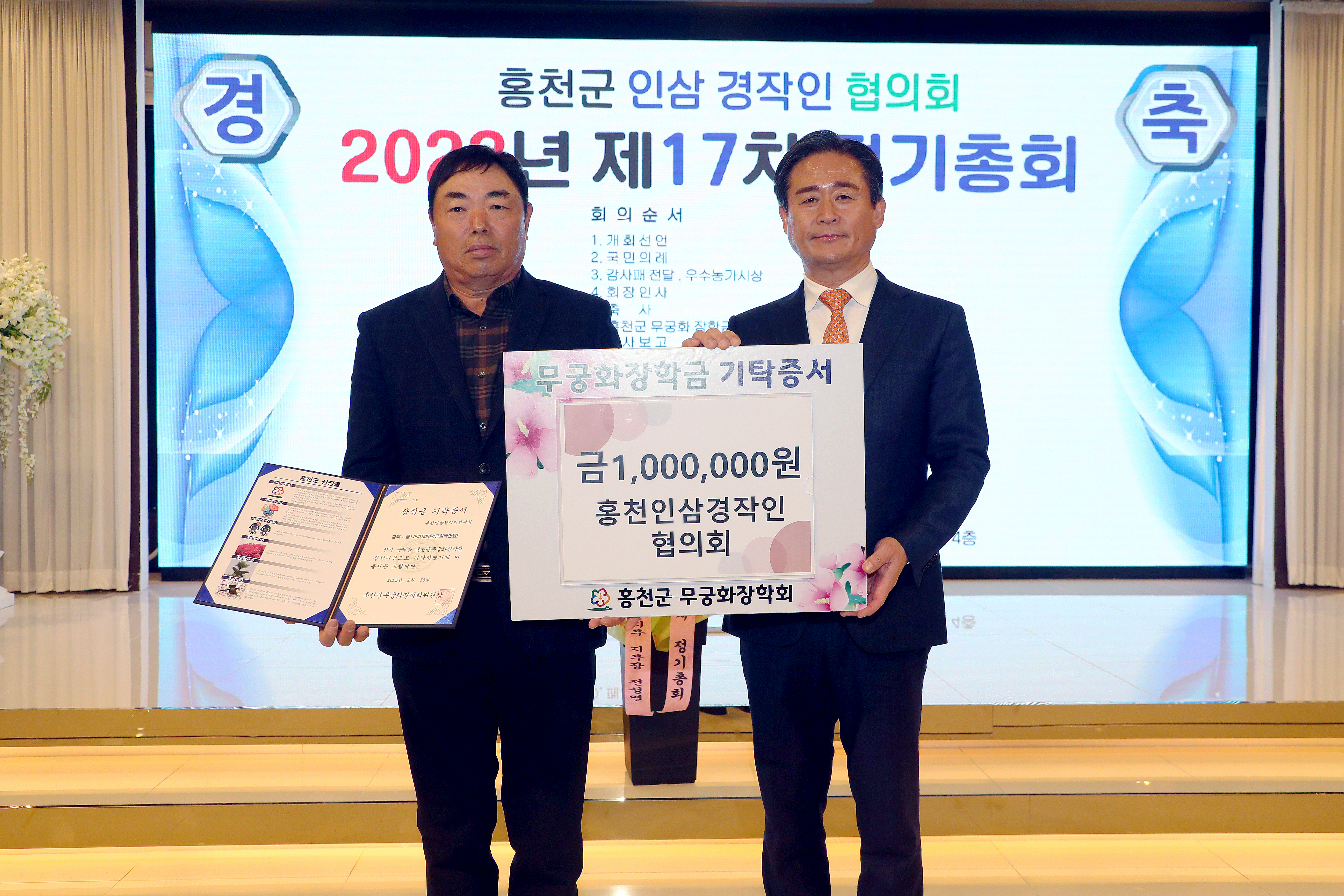 [강원사회복지신문 홍기한 기자]=홍천인삼경작인협의회(회장 신봉환)는 지난 1월 30일 크리스탈웨딩홀에서 개최된 홍천인삼경작인협의회 연시총회에서 인재육성을 위한 무궁화장학금 100만원을 기탁했다.
