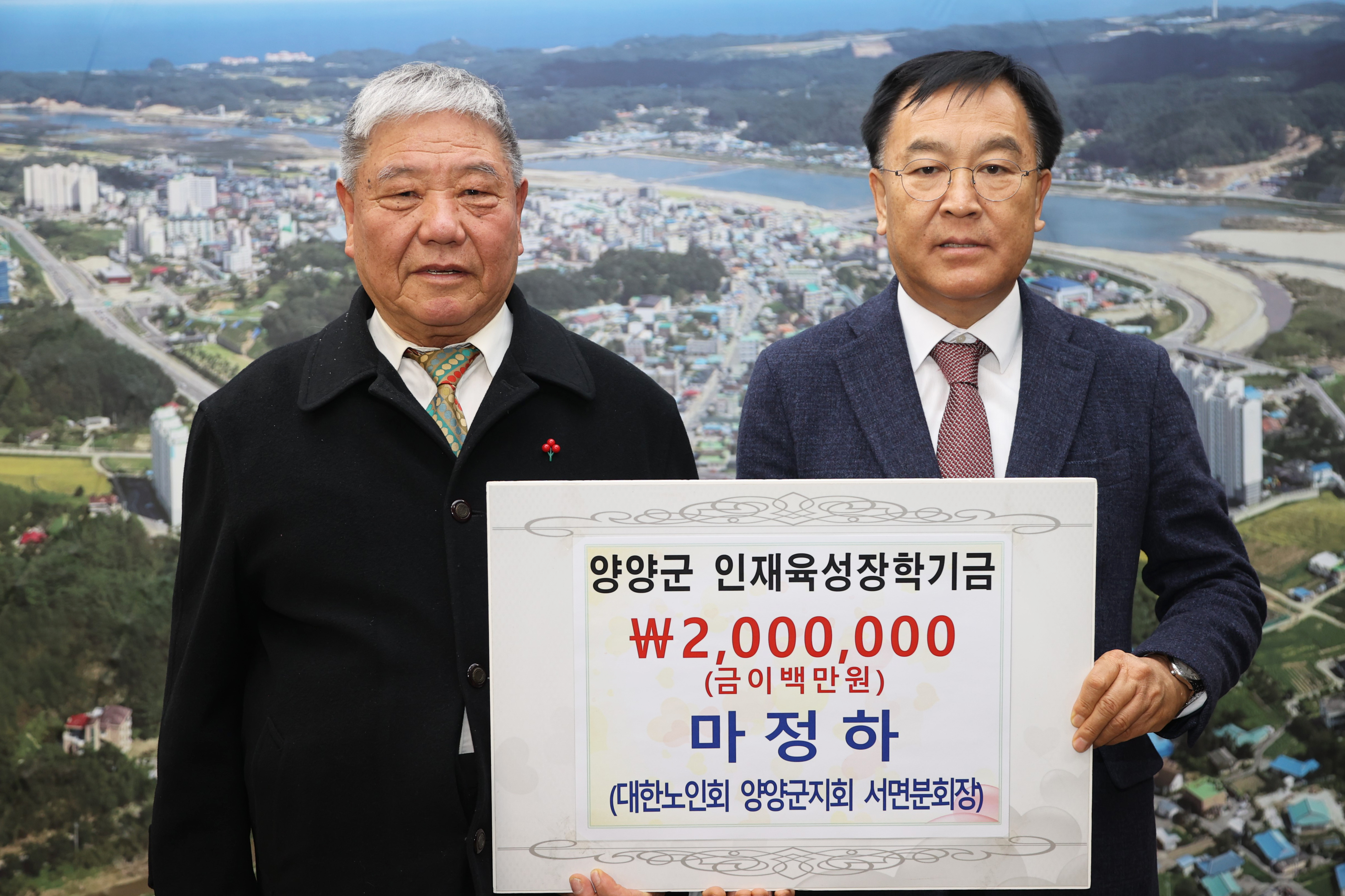 [강원사회복지신문 김도연 기자]=자서전 출판 기념회 수익금 2백만 원 기탁 마정하 양양군 서면노인회장(76세)이 지난 1월 27일, 본인의 자서전 출판기념회 수익금(2백만 원)을 양양군 인재육성장학기금으로 기탁했다. 마정하 회장은 지난 1월 14일, 본인의 파란만장했던 일대기를 기록한 자서전 7전8기 '안 되면 될 때까지'...