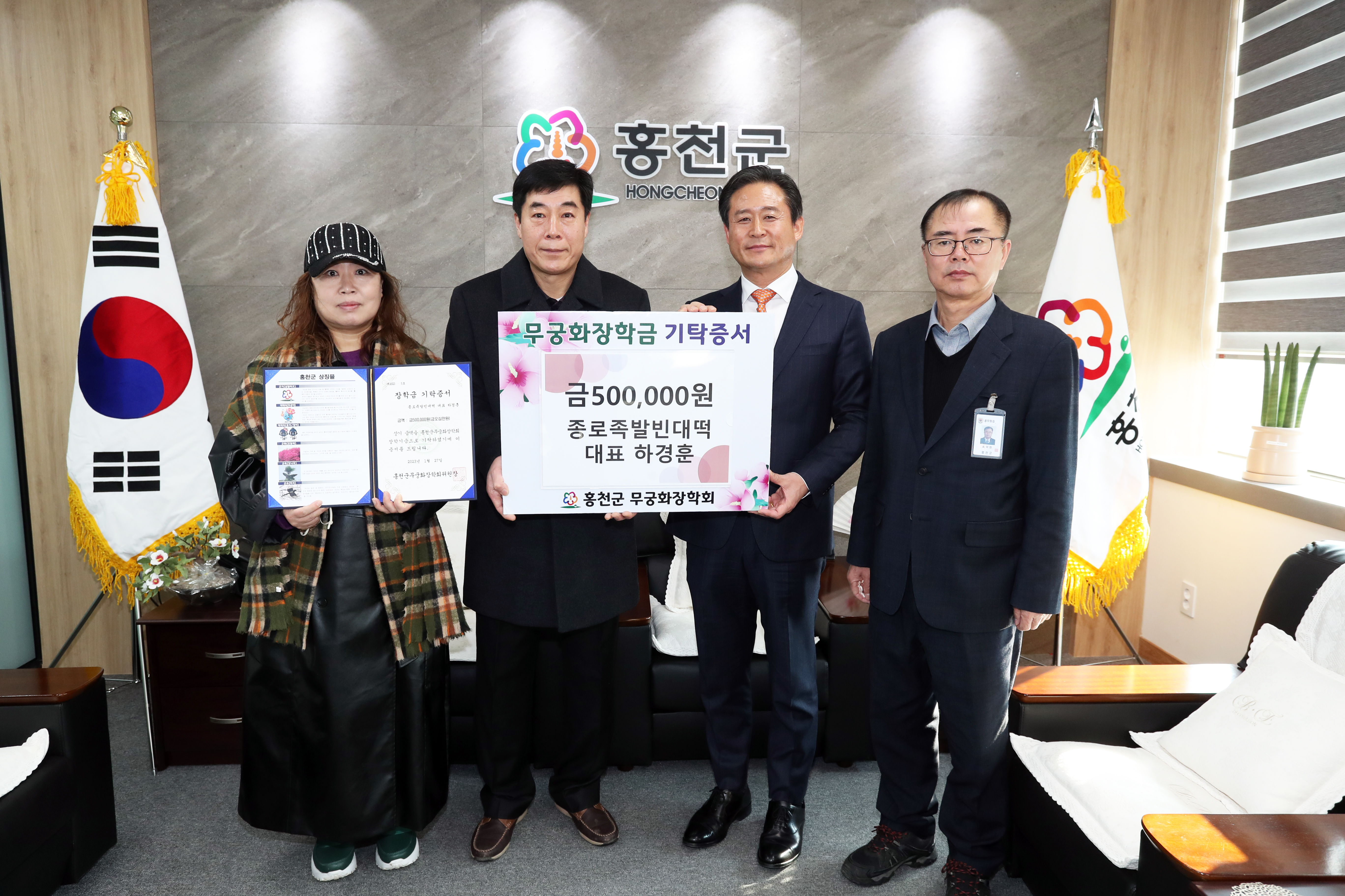 [강원사회복지신문 홍기한 기자]=종로족발빈대떡(대표 하경훈)은 지난 1월 27일 홍천군청을 방문해 인재육성을 위한 무궁화장학금 50만원을 기탁했다.
