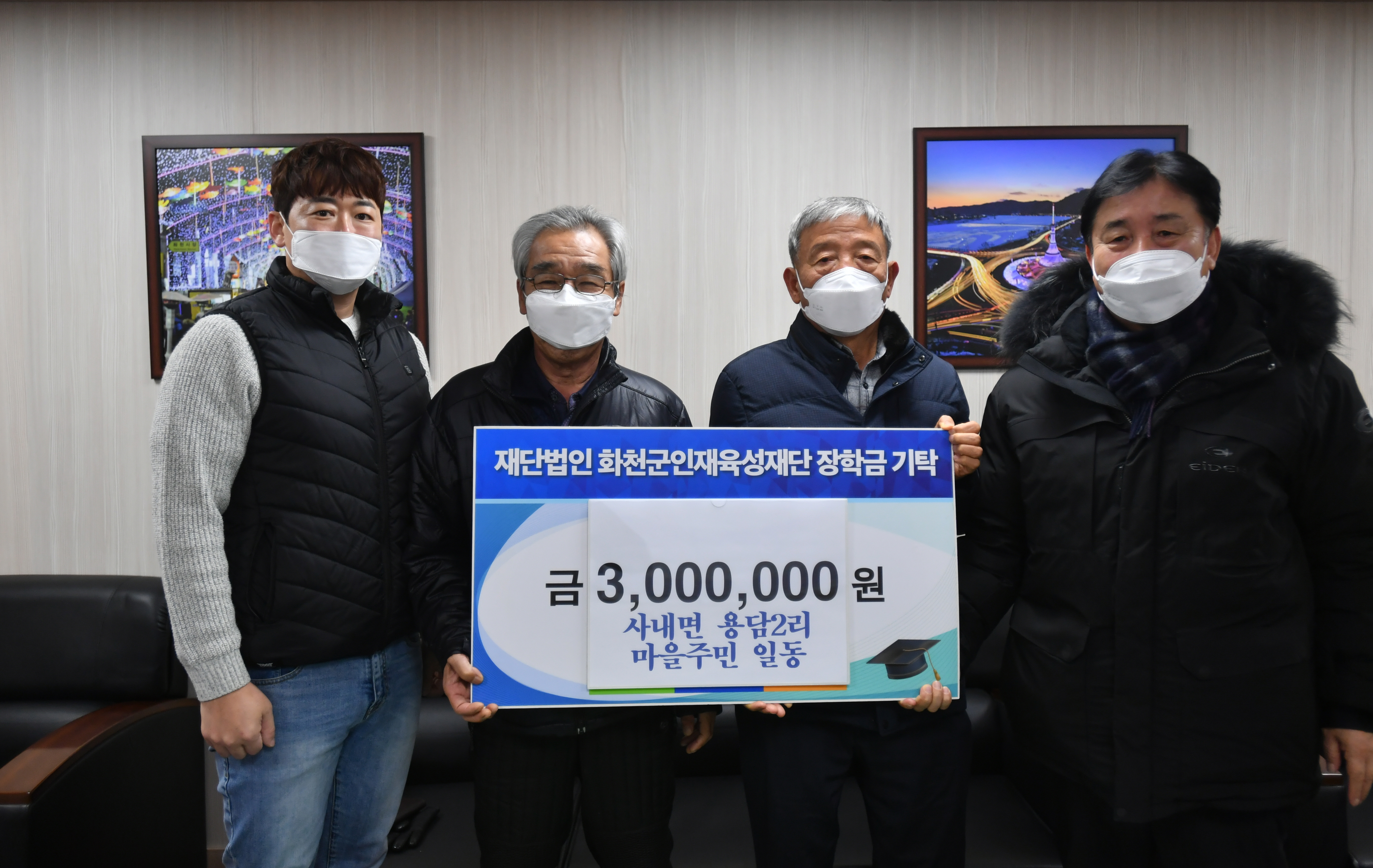 [강원사회복지신문 이정환 기자]=화천군 사내면 용담2리 주민들은 지난 1월 12일 화천산천어축제장을 방문해 최문순 (재)화천군 인재육성재단 이사장에게 장학금 300만원을 기탁했다.