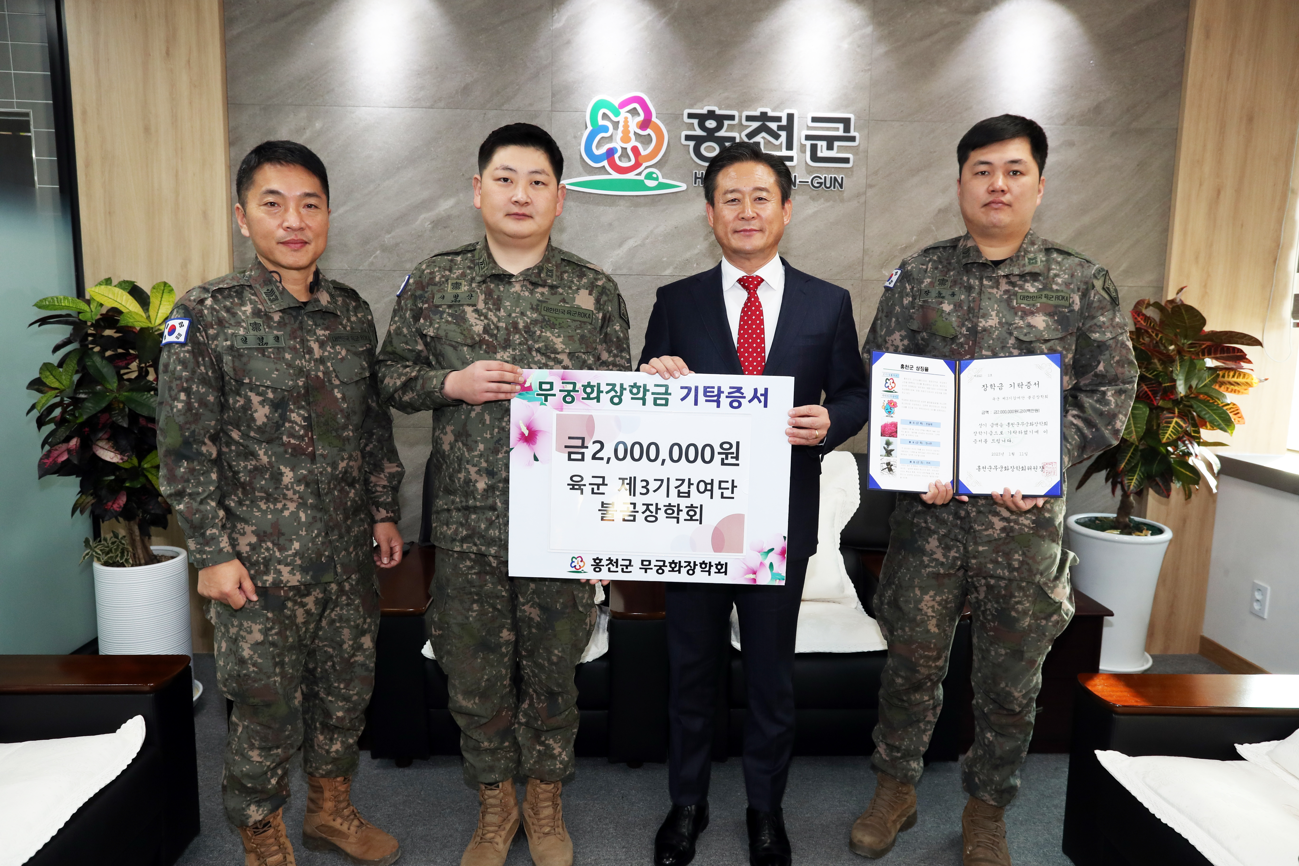 [강원사회복지신문 홍기한 기자]=육군 제3기갑여단 불곰장학회는 지난 1월 11일 홍천군청을 방문해 인재육성을 위한 무궁화장학금 200만원을 기탁했다.