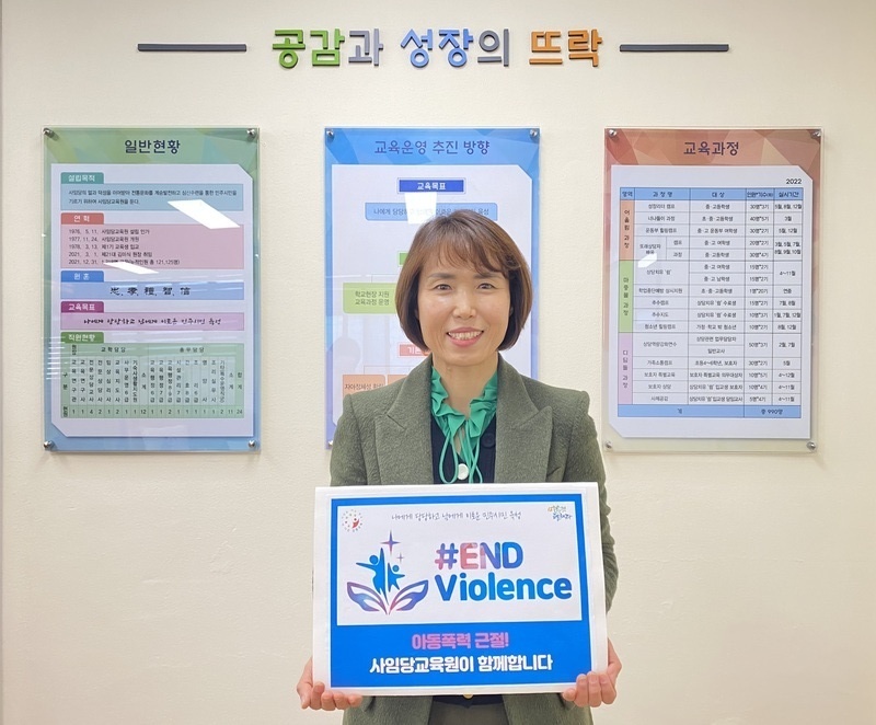 [강원사회복지신문 서은진 기자]=사임당교육원 최현주 원장은 지난 1월 3일(화) 아동 폭력 근절을 위한 '#END Violence' 릴레이 캠페인에 동참했다. '#END Violence' 캠페인은 '폭력을 멈추게 하는 것은 바로 우리의 관심입니다(Take action, stop violence)'라는 슬로건 하에 아동·청소년을 대상으로 한 모든 폭력에 적극 ...