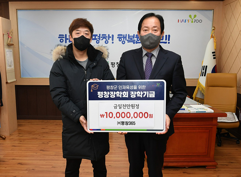 [강원사회복지신문 김종한 기자]=평창 365(대표 지준영)는 지난 1월 4일 평창군청을 방문하여 평창장학회에 장학금 1천만 원을 기탁하였다. 지준영 대표는 "앞으로 평창군을 이끌어갈 학생들이 경제적 여건에 구애받지 않고 꿈을 이루는 데 조금이나마 도움이 되길 바란다."라고 전했다. 평창장학회 이사장인 심재국 평창군수...