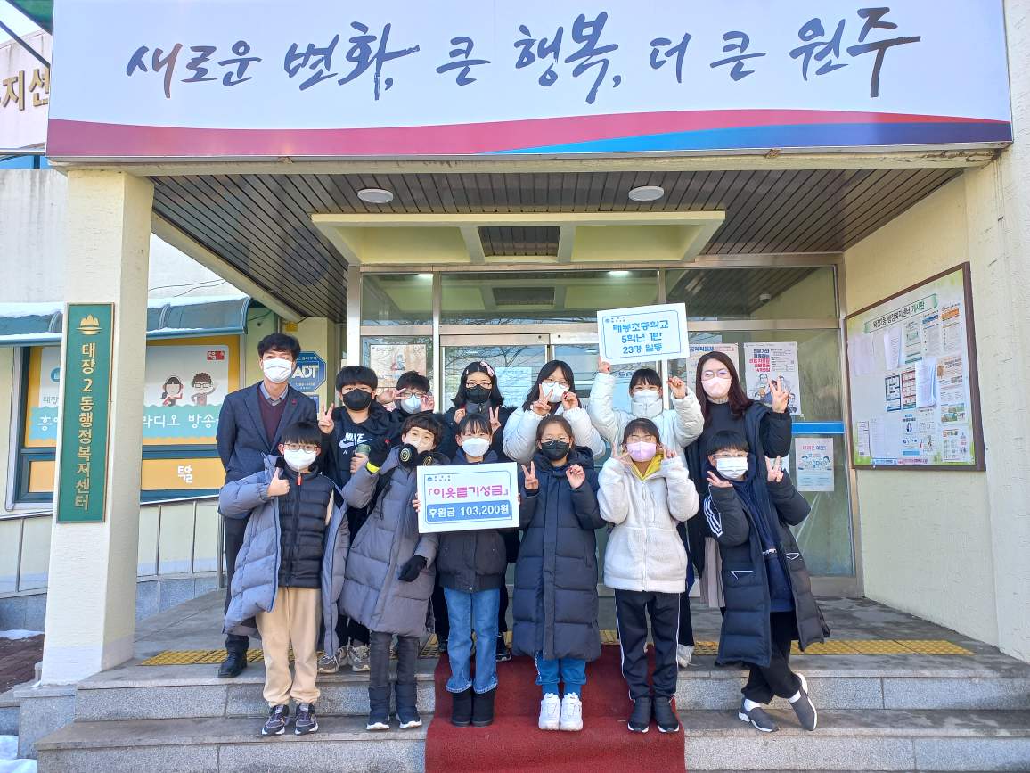 [강원사회복지신문 김도연 기자]=원주 태봉초등학교 5학년 1반(담임교사 이수연) 학생 일동은 지난 12월 29일 어려운 이웃돕기 성금 103,200원을 태장2동 행정복지센터(동장 양동수)에 전달하였다. 태봉초등학교 5학년 1반 23명은 알뜰시장 행사를 통해 발생한 수익금을 어려운 이웃들을 위해 사용하기로 뜻을 모았다.