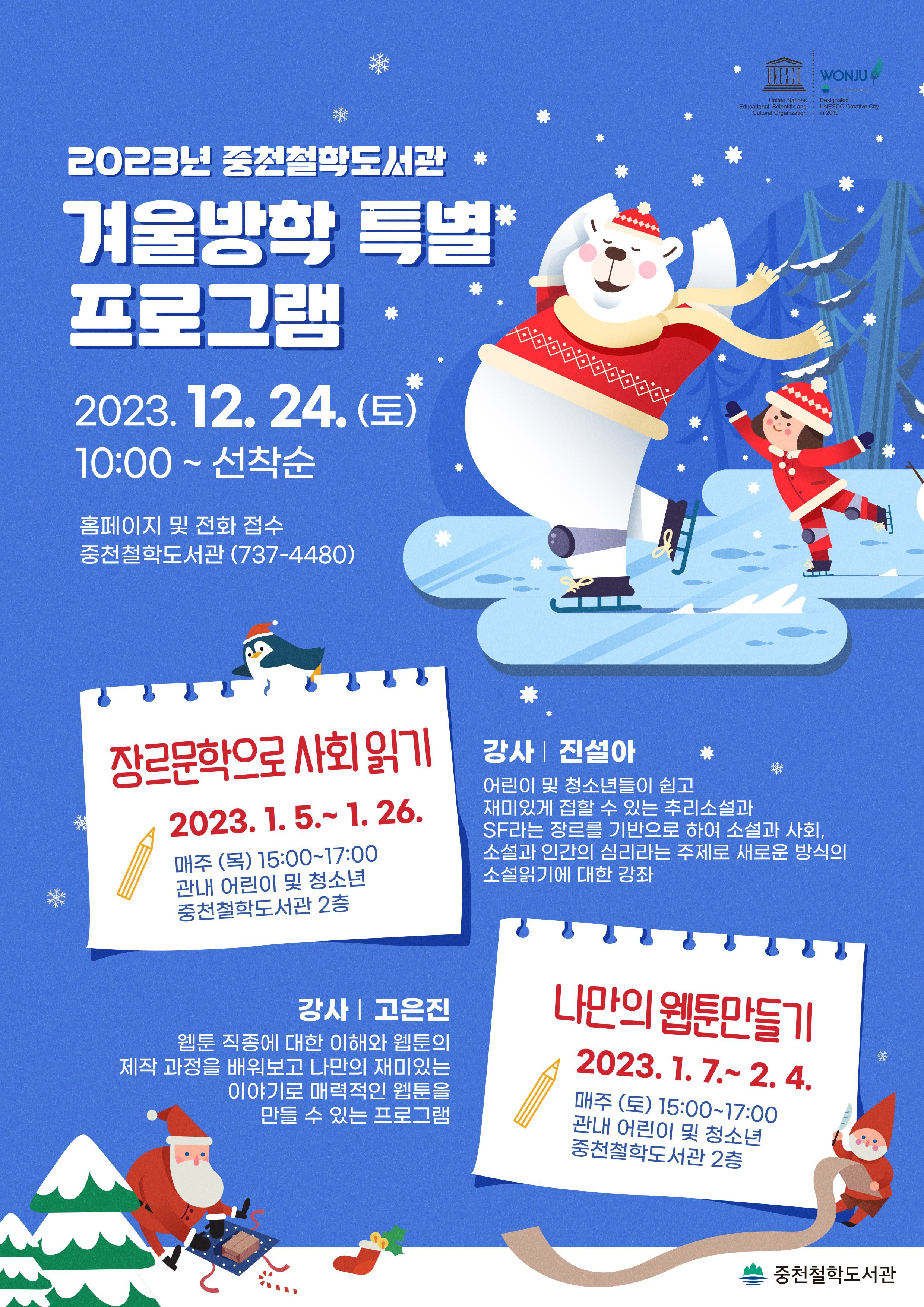 [강원사회복지신문 서은진 기자]=지난 12월 24일 오전 10시부터 원주시립중앙도서관 홈페이지 및 전화로 선착순 접수 장르문학으로 사회읽기, 나만의 웹툰 만들기 등 2개 강좌 운영 중천철학도서관은 어린이 및 청소년의 도서관 이용 활성화를 위해 겨울방학 특별프로그램을 운영한다. 먼저, 내년 1월 5일부터 1월 26일까지 ...