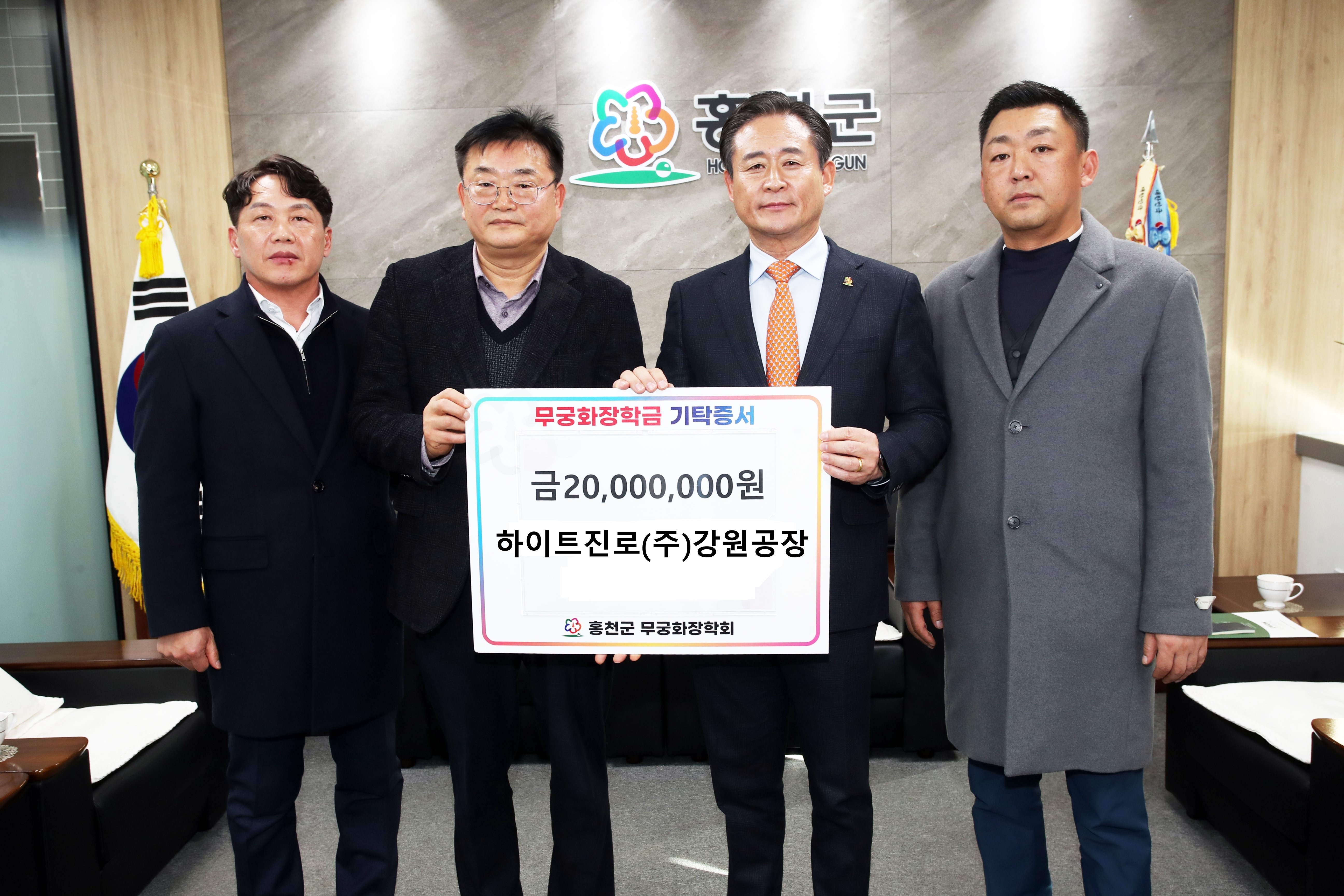 하이트진로(주)강원공장(대표 신민철)이 12월 26일 홍천군청을 방문하여 홍천군 인재 육성을 위한 무궁화장학금을 2,000만 원을 기탁했다. 하이트진로 (주)강원공장은 2018년도부터 꾸준히 연말에 무궁화장학금을 기탁하며 홍천군 인재 양성에 도움이 되기를 바라는 마음을 전하고 있다. 신민철 공장장은 “무궁화장학금 기탁...
