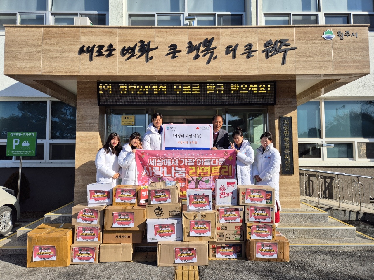 원생들이 직접 모은 라면으로 따뜻한 연말을 선물 원주시 지정면 아이원태권도장(관장 염규문·황일란)은 지난 12월 31일 지정면 행정복지센터에 원생들과 십시일반 모은 라면 23박스를 기탁했다. 염규문 관장은 “매년 아이들과 함께 뜻깊은 기부를 해오고 있다. 지정면의 어려운 이웃들에게 꼭 도움이 되었으면 좋겠다.”라...