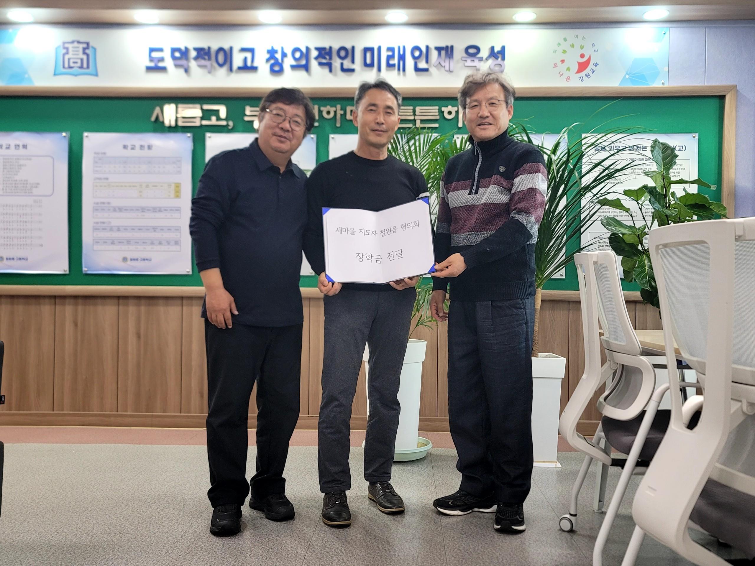 새마을지도자 철원읍협의회(회장 홍기삼)는 12월 27일(금) 철원중고등학교장(교장 유재용)를 찾아 장학금(180만원)을 기탁했다. 홍기삼 새마을지도자 철원읍협의회 회장은 “지역사회 후배들에게 장학금 전달을 통하여 도움을 줄 수 있어 기쁘다.”라고 했으며, 유종현 새마을지도자 철원읍 협의회 부회장은 “새마을 회원들...