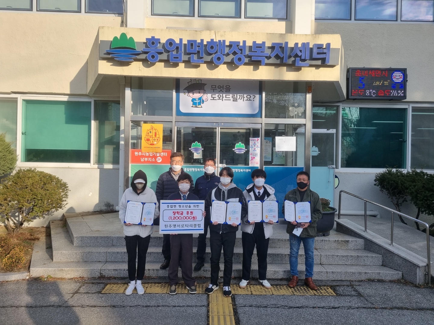 [강원사회복지신문 서은진 기자]=원주영서로타리클럽(회장 전정환)은 지난 12월 8일 흥업면 행정복지센터를 찾아 저소득가정 청소년 4명에게 120만 원 상당의 장학금과 장학증서를 전달했다. 전정환 회장은 "어려운 환경 속에서도 학업과 하고자 하는 목표를 향해 전념해 꿈을 이룰 수 있길 바란다."라고 전했다. 이연섭 면장...