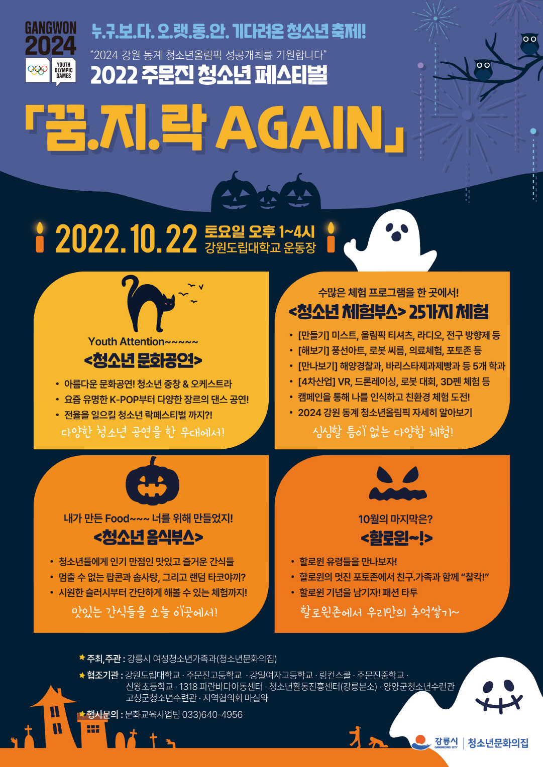 [강원사회복지신문 김도연 기자]=강릉시청소년문화의집, 코로나 이후 3년 만에 청소년 페스티벌 개최 강릉시청소년문화의집(이하 문화의집)은 지난 10월 22일(토) 13시 강원도립대 운동장에서 2022 주문진 청소년 페스티벌 '꿈.지.락 AGAIN' 행사를 개최했다. 이번 행사는 2024년 강원동계청소년올림픽 성공개최 열기를 확산...
