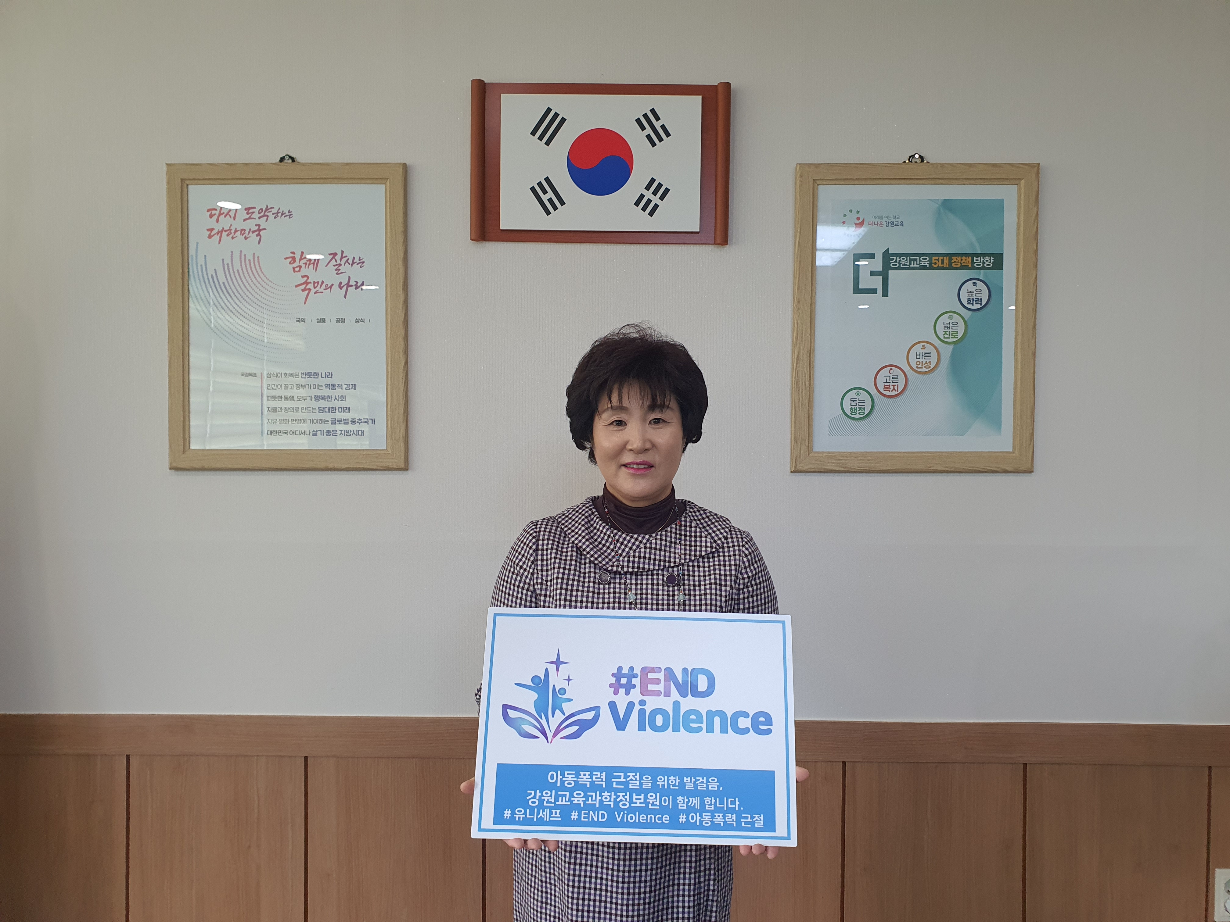 [강원사회복지신문 서은진 기자]=이은숙 강원교육과학정보원장은 지난 10월 12일 아동폭력 근절 온라인 캠페인(END Violence)에 동참했다. 이번 캠페인은 '폭력을 멈추게 하는 것은 바로 우리의 관심입니다(Take action, stop violence)'라는 슬로건으로 아동·청소년을 향한 모든 폭력을 근절시키기 위해 외교부와 유니세프...
