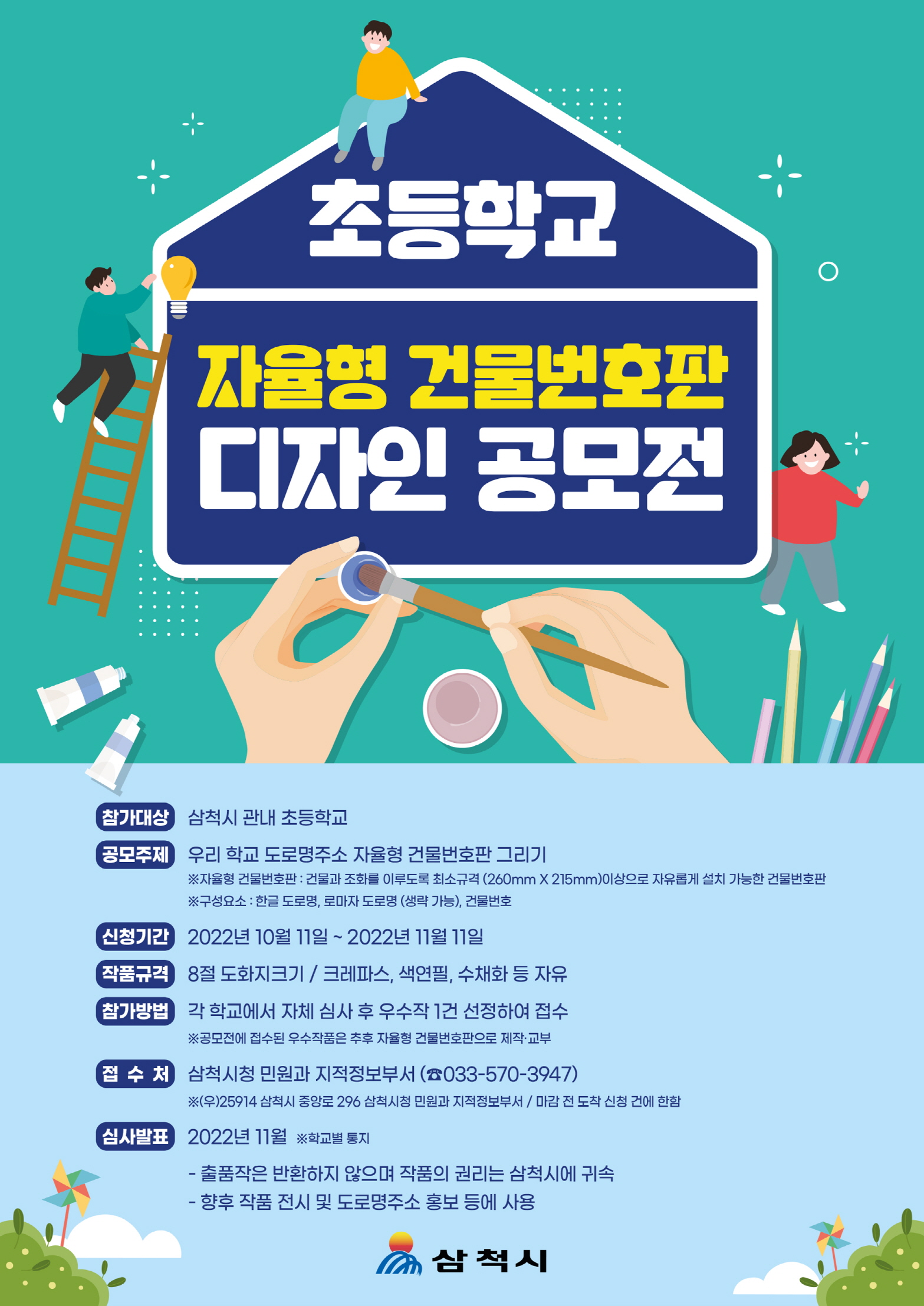 [강원사회복지신문 김종한 기자]=10월 11일부터 11월 11일 18시까지 접수 공모주제 : 우리 학교만의 특색있는 도로명주소 건물번호판 그리기 최우수상 1작품, 우수상 1작품, 장려상 3작품 선정 / 11월 중 발표 삼척시가 어린이들의 도로명주소에 대한 관심도를 높이고 자율형 건물번호판의 활성화를 위해 '초등학교 자율형 건...