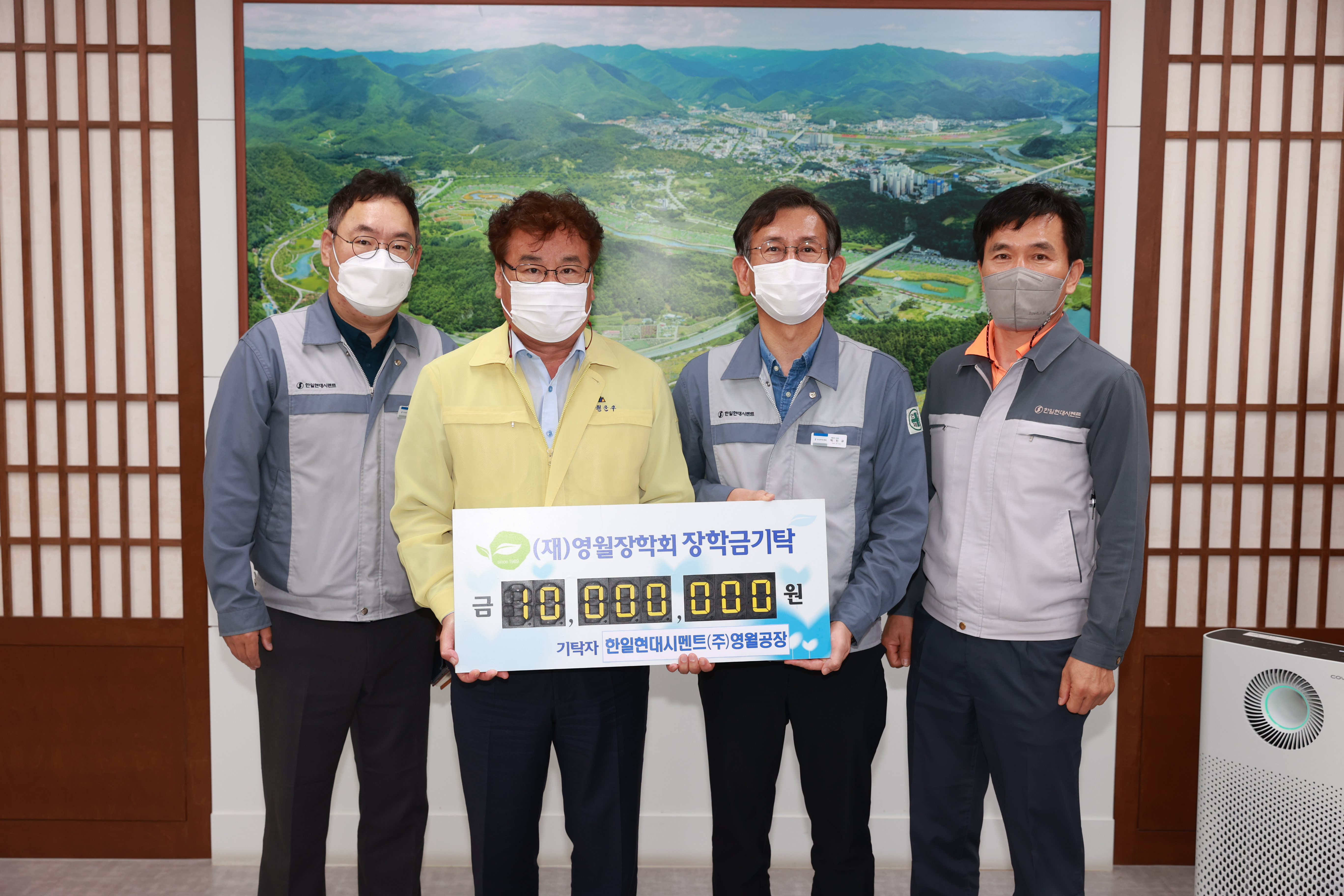 [강원사회복지신문 김종한 기자]=한일현대시멘트(주)영월공장(대표 박진규)에서 지난 10월 6일 영월지역 인재육성을 위해 장학금으로 쓰이길 바란다며 1천만원을 재단법인 영월장학회(이사장 최명서)에 기탁하였다.