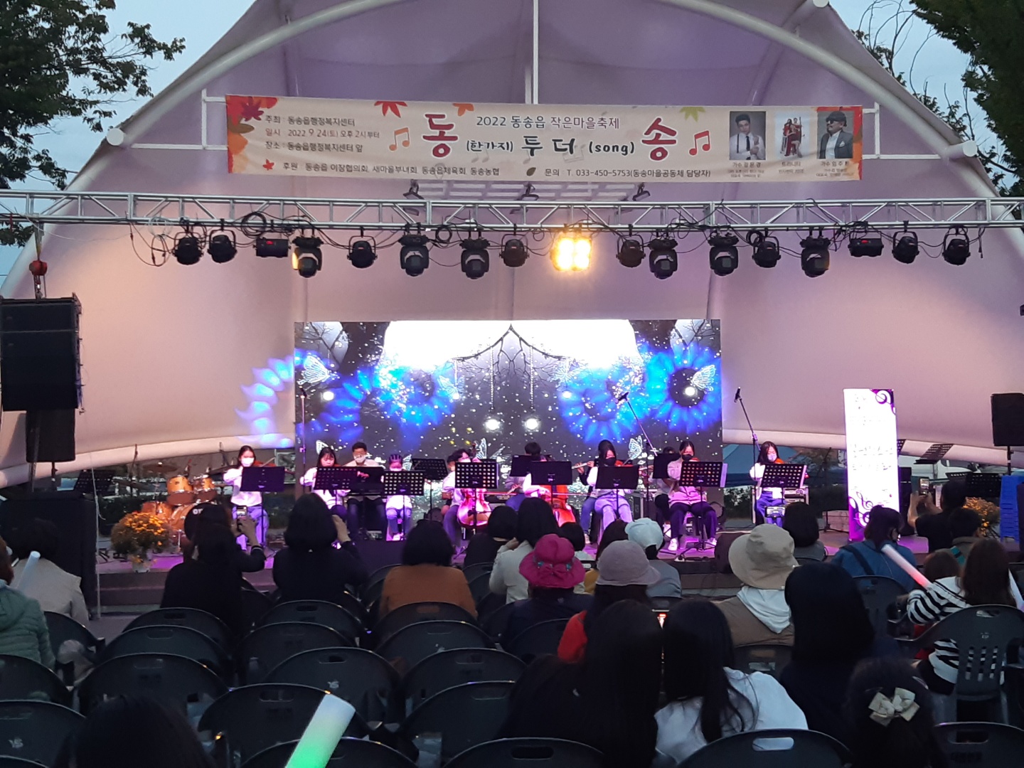 [강원사회복지신문 이정환 기자]=철원군청소년오케스트라(단장 정세영) 청소년 봉사자들이 지난 9월 24일(토) 철원군 동송읍 행정복지센터 일원에서 열린 제3회 '동(한가지) to the 송(Song)' 마을 축제에서 재능나눔 봉사활동을 하였다. 3년만에 열린 마을 전통축제에서 청소년오케스트라팀의 연주는 행사를 더욱 더 뜻깊게...