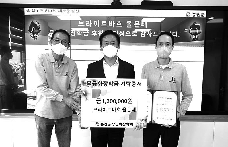 [강원사회복지신문 서은진 기자]=홍천군 남면 소재 브라이트바흐 올몬테(대표 성혁제)는 홍천강 별빛음악 맥주축제 참가 수익금의 일부인 120만원을 인재육성을 위한 무궁화장학금으로 기탁했다.