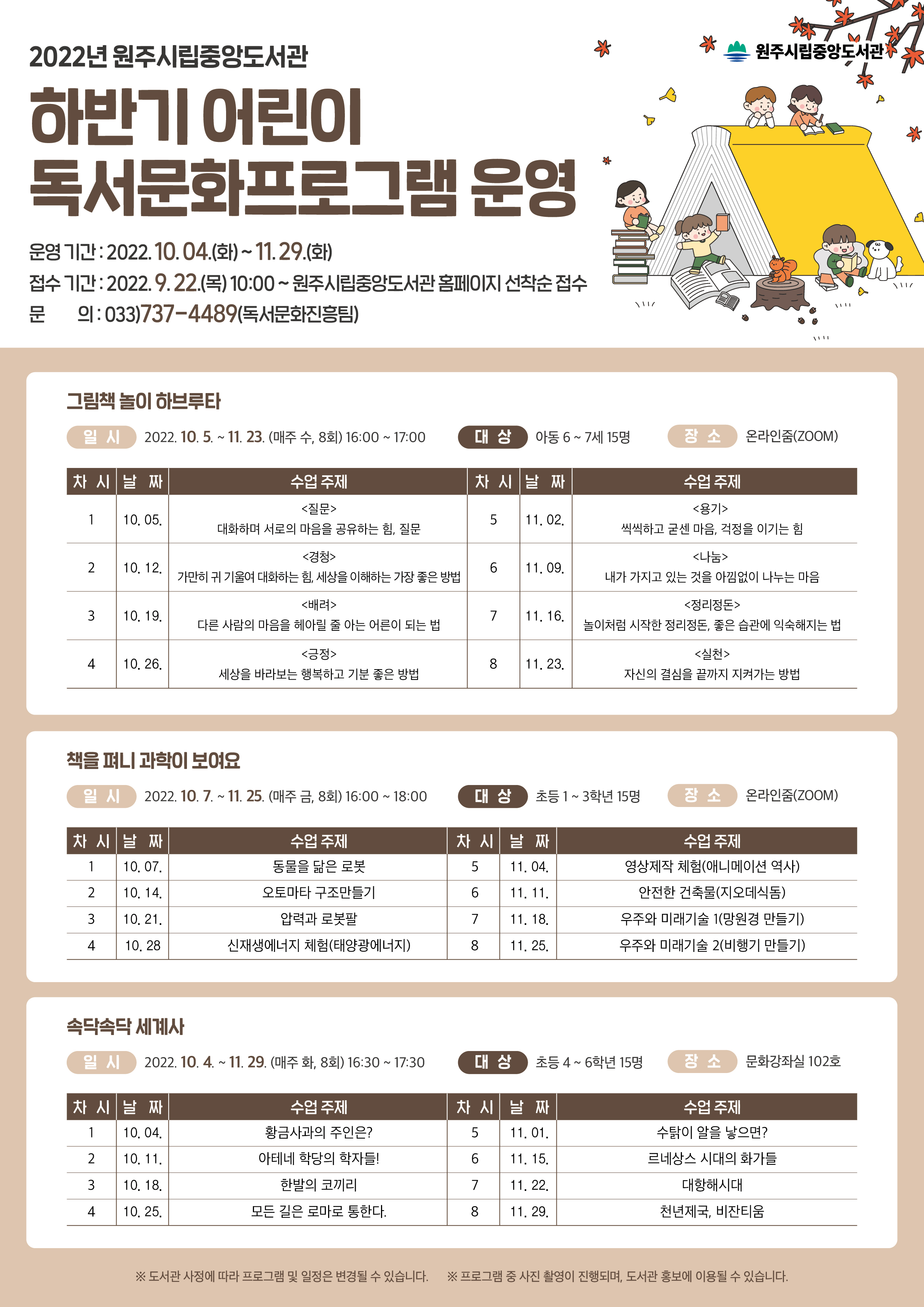 [강원사회복지신문 서은진 기자]=지난 9월 22일 오전 10시부터 도서관 홈페이지 선착순 접수 대면 강의와 온라인(ZOOM) 병행 운영 원주시립중앙도서관은 어린이와 청소년을 대상으로 독서문화 활동 향유 기회를 제공하기 위해 다양한 주제의 프로그램을 연령별로 운영한다. 하반기 프로그램은 어린이 독서문화 프로그램과 어...