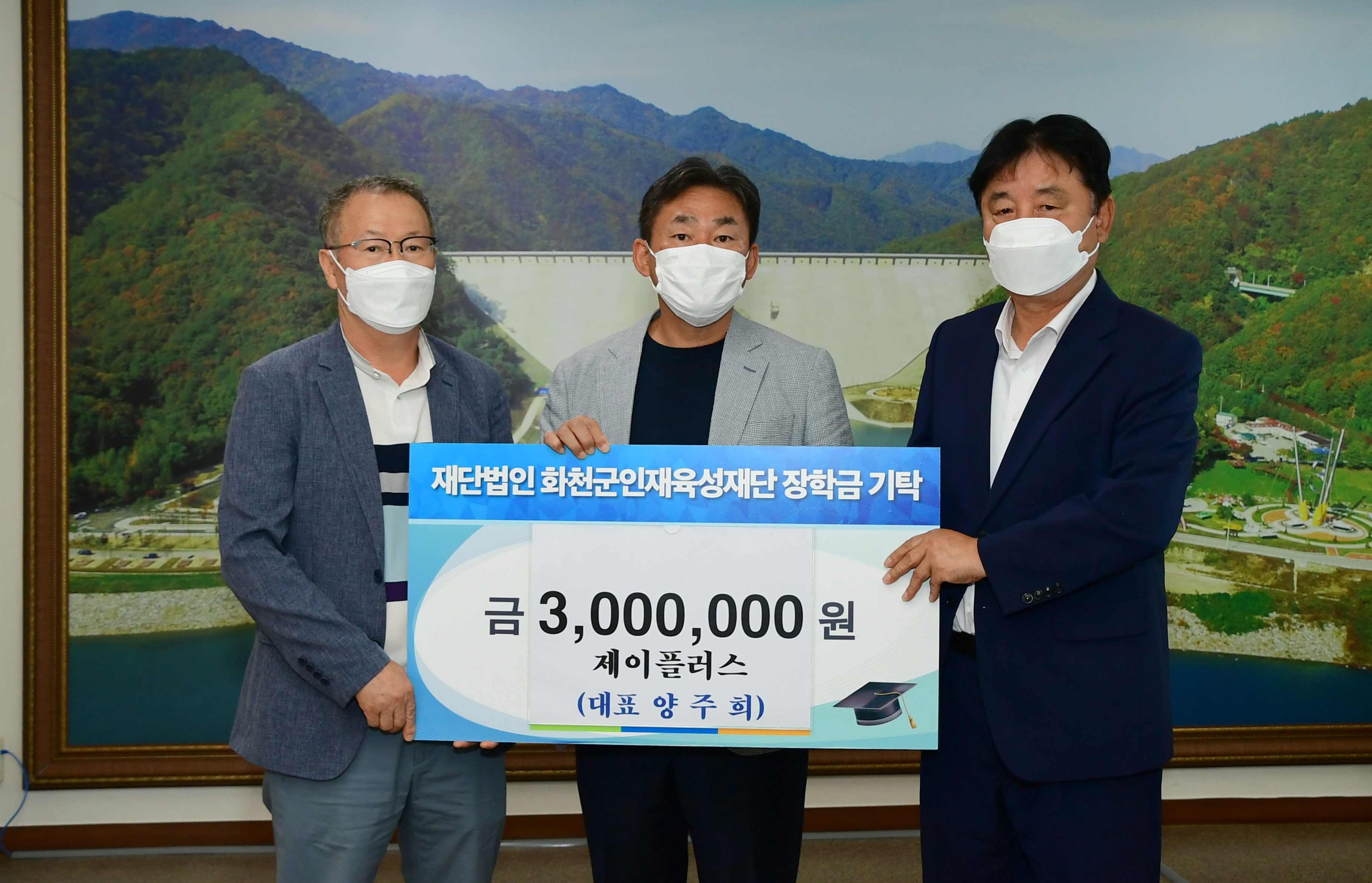 [강원사회복지신문 홍기한 기자]=화천군 하남면 농공단지 입주업체인 제이플러스 (대표: 양주희)는 지난 9월 22일 최문순 화천군 인재육성재단 이사장에게 장학금 300만원을 기탁했다.