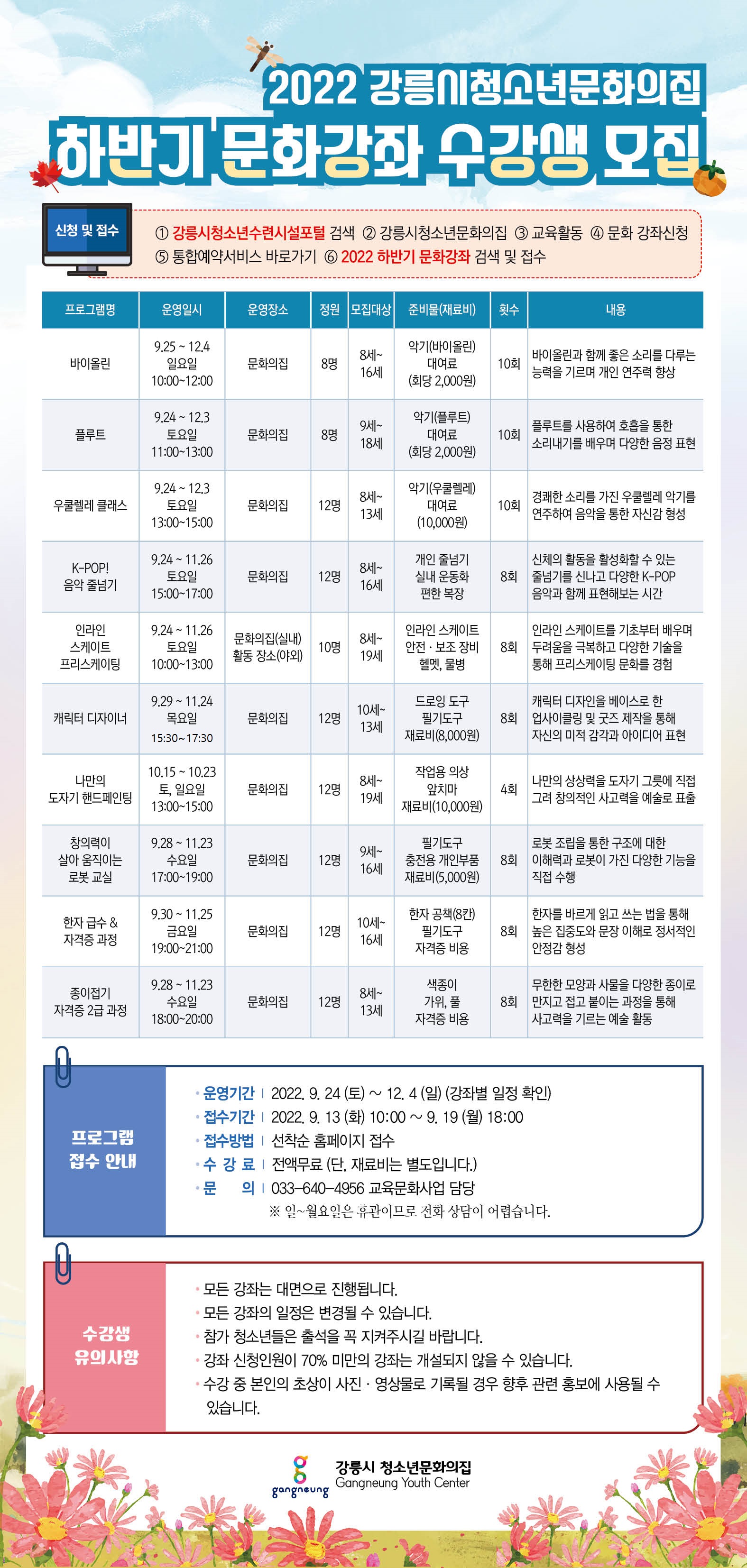 [강원사회복지신문 김종한 기자]=나만의 도자기 핸드페인팅, 우쿨렐레 클래스 신설 및 하반기 내용 강화 강릉시청소년문화의집(이하 문화의집)에서 2022년 하반기 문화강좌를 9월 19일(월)까지 접수한다. 총 10개로 이루어진 하반기 문화강좌에는 문화·체육 분야에 '우쿨렐레 클래스', 진로·체험 분야에 '나만의 도자기 핸...