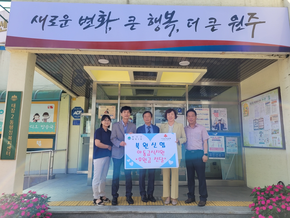 [강원사회복지신문 서은진 기자]=북원신협(이사장 신영희)은 지난 8월 16일 원주시 태장2동 행정복지센터(동장 양동수)를 방문해 결식아동을 위한 '2022 착한가맹점' 후원금 238만 원을 전달했다. '2022 착한가맹점'은 아동급식카드를 사용하는 대상자 159명에게 15,000원 상당의 상품권을 지급하는 사업으로, 관내 17개 협약...