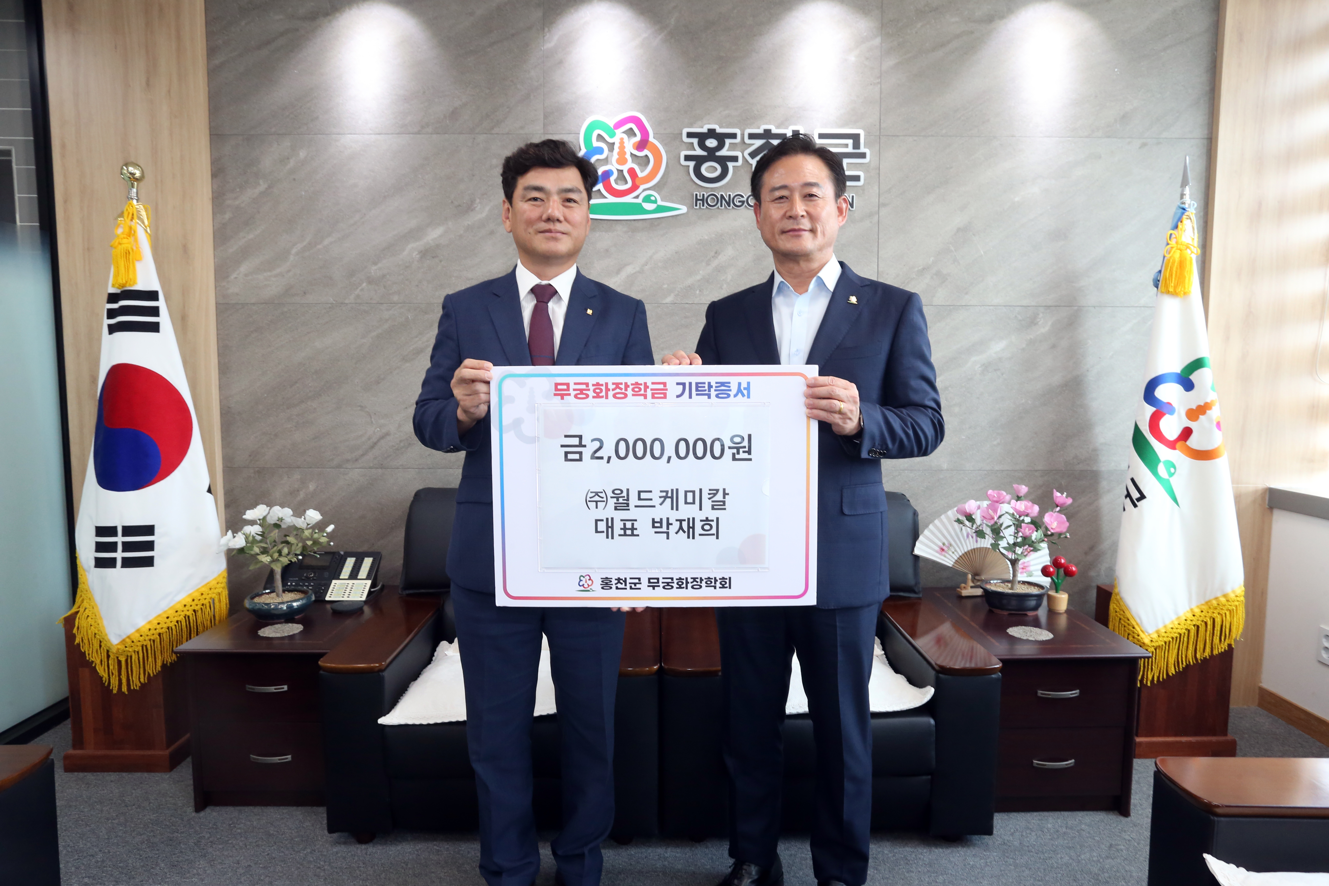(주)월드케미칼(대표 박재희)은 지난 7월 11일 홍천군청을 방문하여 홍천군 인재 육성을 위한 무궁화장학금을 200만 원을 기탁했다. ㈜월드케미칼은 지난 2023년도에도 무궁화장학금을 기탁했으며, 코로나 19 당시에는 힘든 시간을 보내는 이웃들에게 마스크를 기부하는 등 다양한 나눔을 실천하고 있다.
