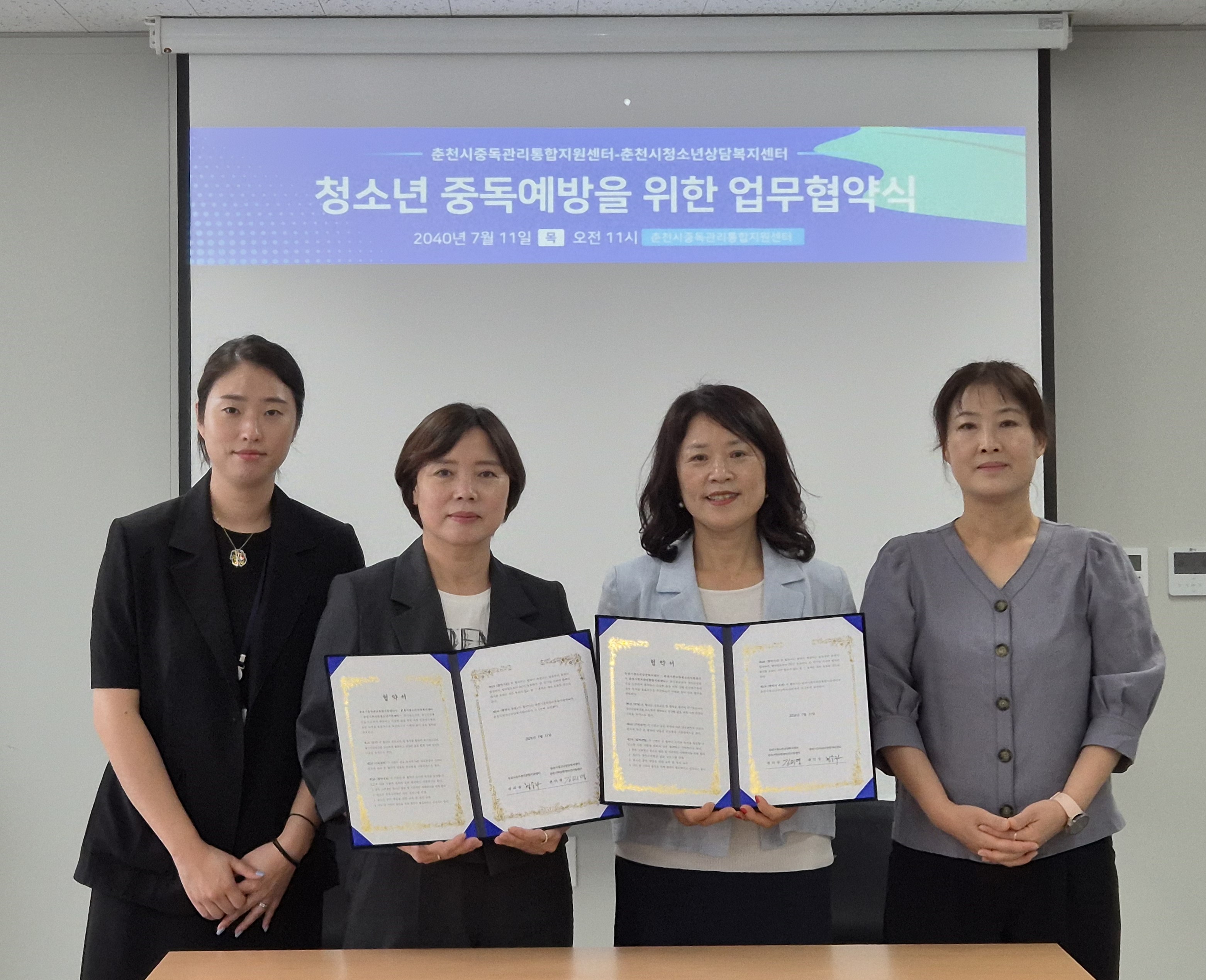 지난 7월 11일 춘천시청소년상담복지센터 업무협약 청소년 중독문제 예방 및 조기 개입…사회 안전망 구축 춘천시중독관리통합지원센터(센터장 정숙자)가 춘천시청소년상담복지센터·춘천시학교밖청소년지원센터(센터장 김미영)와 함께 지역 내 청소년 중독 문제 예방 및 조기 개입에 나선다. 시에 따르면 지난 7월 11일 춘천...