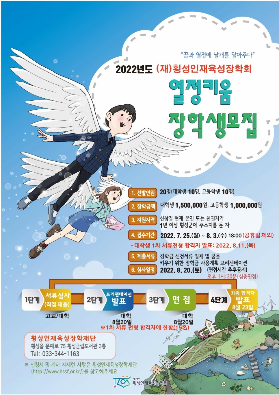 [강원사회복지신문 서은진 기자]=오는 8월 3일까지 방문 신청, 고등학생&대학생 각 10명 선발 학업 이외 분야에서 꿈을 펼쳐가고 있는 지역 인재 지원 (재)횡성인재육성장학회(이사장 조창진)는 지난 7월 25일부터 오는 8월 3일까지, '2022년 열정키움 장학생'을 모집한다. 열정키움 장학생은 학업 이외에 다양한 분야에...