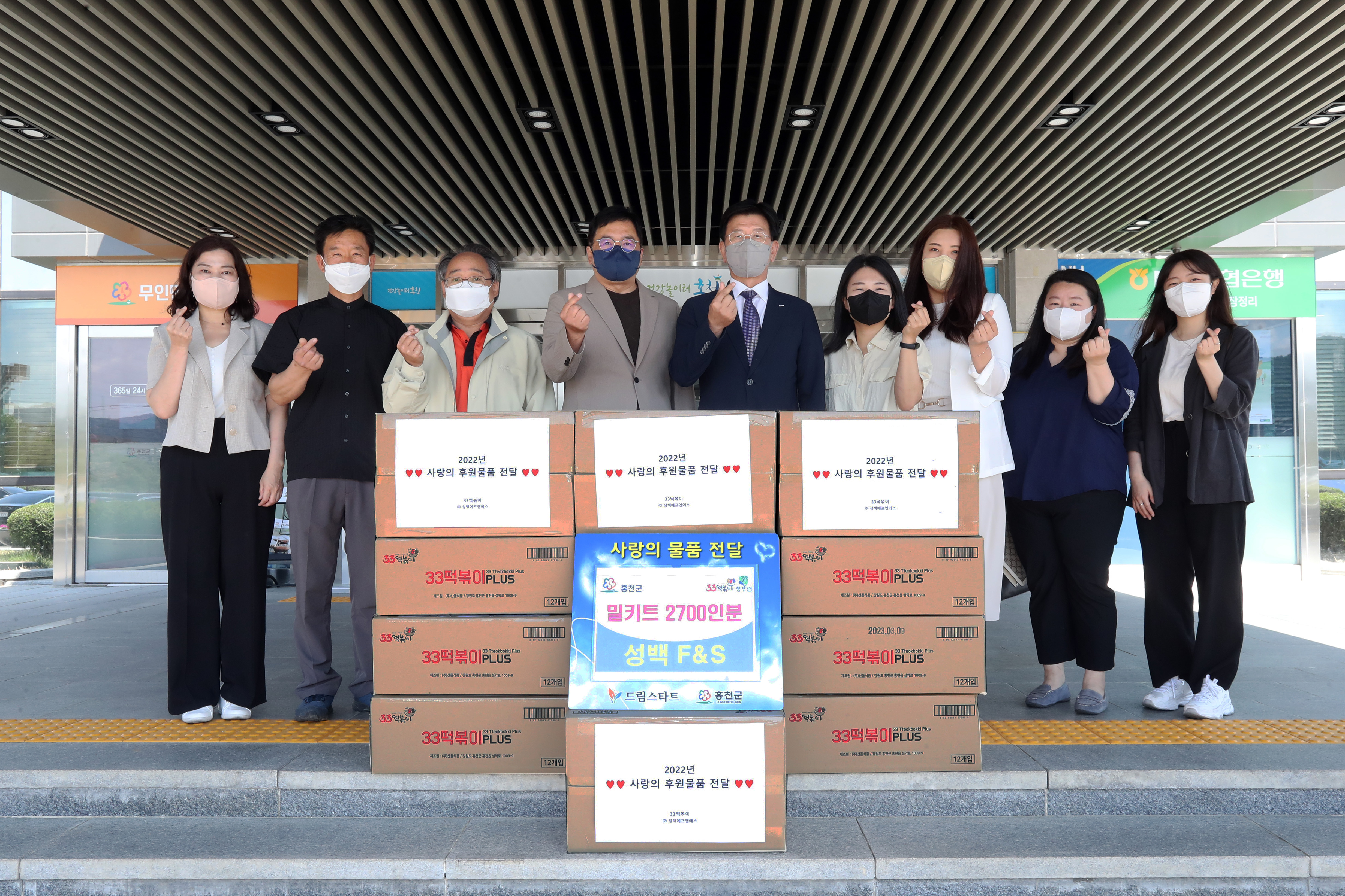 [강원사회복지신문 홍기한 기자]=성백F&S(대표 이호성)는 지난 5월 26일 홍천군청을 방문, 아동복지시설 5곳에 전달할 33떡볶이 밀키트 2,700인분을 전달했다. 성백F&S는 사회공헌활동으로 올해 12월 말까지 매월 밀키트 150세트(1세트 3인분)를 아동복지시설 5곳에 후원할 예정이다. 이호성 성백F&S 대표는 "저...