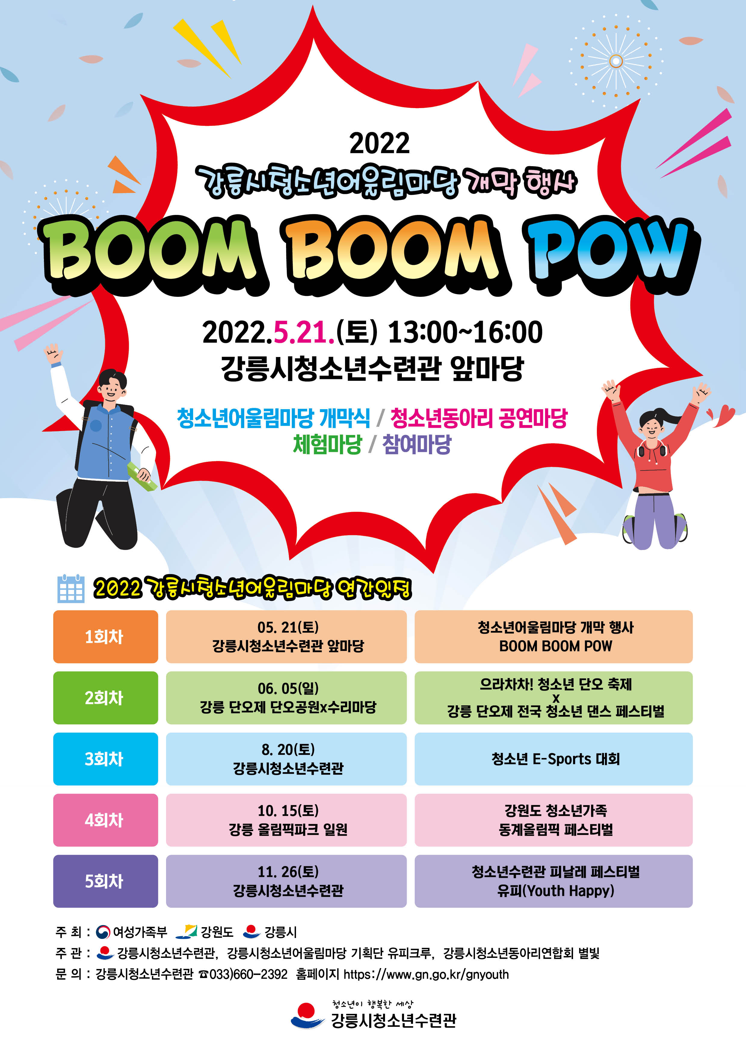 [강원사회복지신문 이정환 기자]=청소년 공연마당, 체험마당, 참여마당 등 즐길거리 풍성 강릉시는 오는 5월 21일(토) 오후 1시 강릉시청소년수련관 앞마당에서 '2022 강릉시 청소년어울림마당 개막 행사(이하 어울림마당)'를 개최한다. 어울림마당은 강릉시 청소년을 위해 15년째 개최되는 대표 축제로 청소년이 주체가 되어...