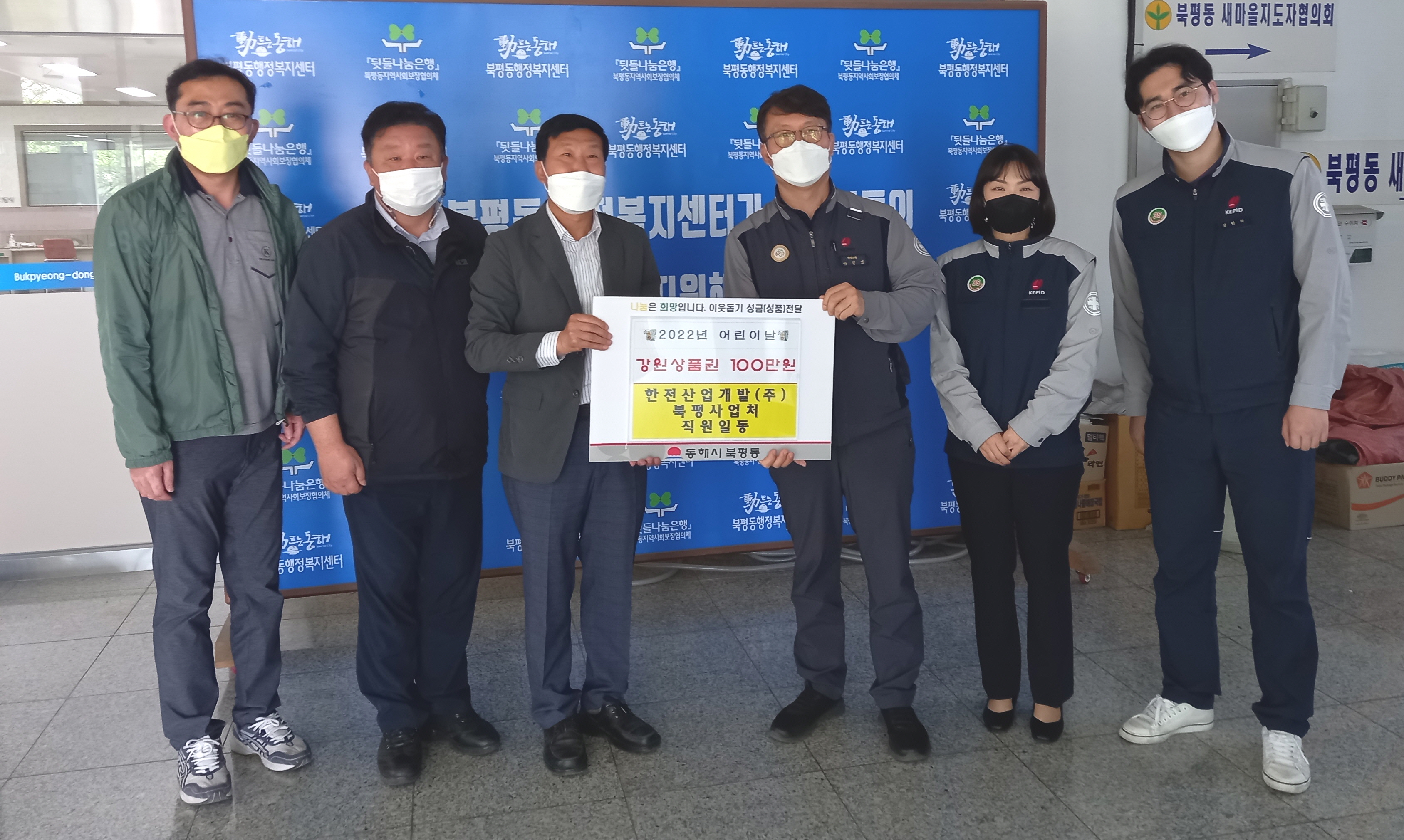 [강원사회복지신문 김종한 기자]=강원상품권 100만원 기탁 동해시 북평동 소재 (주)한전산업개발 북평사업처(처장 한일섭)에서 지난 5월 4일 북평동행정복지센터를 방문, '어린이 날'을 맞아 지역의 소외된 취약가구 아동 후원을 위해 직원들이 모은 성금으로 강원상품권 100만원을 기탁했다. (주)한전산업개발 북평사업처는...