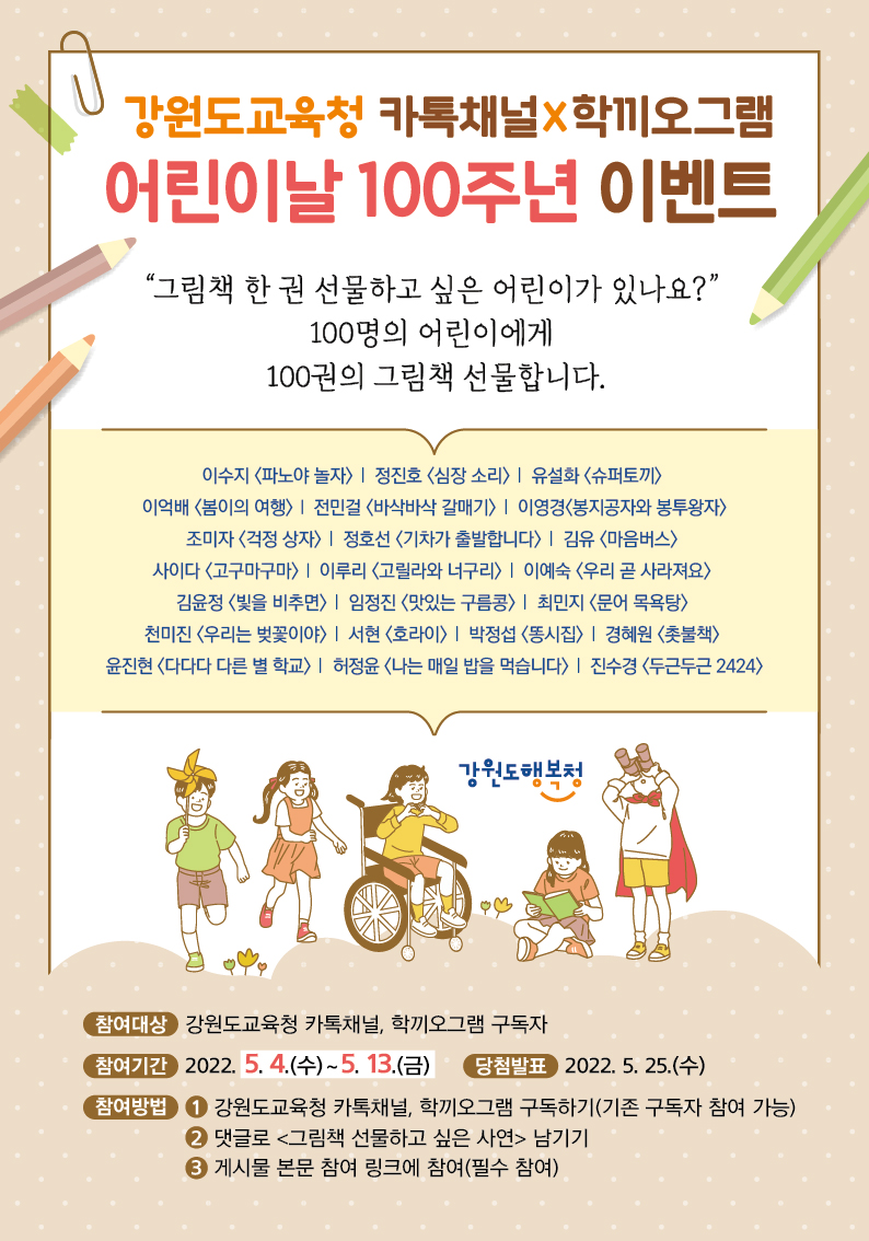 [강원사회복지신문 홍기한 기자]=강원도교육청은 지난 5월 4일(수)부터 오는 5월 13일(금)까지, 어린이날 100주년을 맞아 어린이들에게 그림책 100권을 선물하는 이벤트를 진행했다. 이벤트 참여는 '강원도교육청 카카오톡 채널'이나 '학끼오그램'을 구독 후, 어린이에게 그림책을 선물하고 싶은 사연을 남기면 추첨을 통해 ...