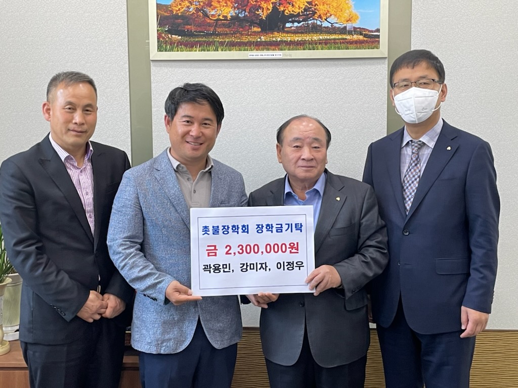 [강원사회복지신문 서은진 기자]=인재 육성을 위한 (재)촛불장학회 장학금 기탁자가 이어져 지역사회에 훈훈한 미담이 되고 있다. 먼저 1998년 촛불장학금 수혜자인 (주)우진조경 곽용민 이사(서울대 졸업)가 지난 5월 4일 장학금 100만 원을 기탁했다. 곽용민 이사는 2020년부터 매년 1백만 원씩 장학금을 기탁하고 있다. 이...