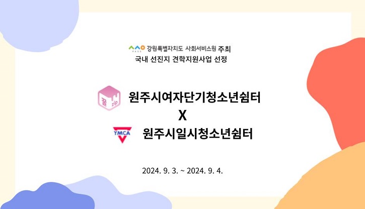 원주시여자단기청소년쉼터가 지난 6월 17일 원주시일시청소년쉼터와 함께 강원특별자치도 사회서비스원이 주최한 2024년 사회서비스 종사자 ‘국내 선진지 견학지원사업’에 선정되었다. 선진지 견학 지원사업은 강원특별자치도 사회서비스원이 주최한 사업으로 국내 사회서비스 분야별 희망 선진지 방문과 ESG 활동, 관련분...