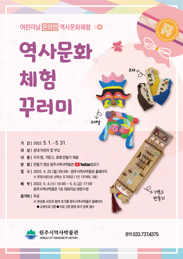 [강원사회복지신문 서은진 기자]=4월 25일 오전 9시부터 선착순 접수 역사문화체험 꾸러미, 도자기 전통 문양 장식하기 원주시 역사박물관(관장 김흥배)은 5월 가정의 달과 어린이날을 맞아 '어린이날 온라인 역사문화체험'을 운영한다 5월 4일 오전 10시부터 원주시역사박물관 유튜브에 #어린이날 역사문화체험 꾸러미 만들...