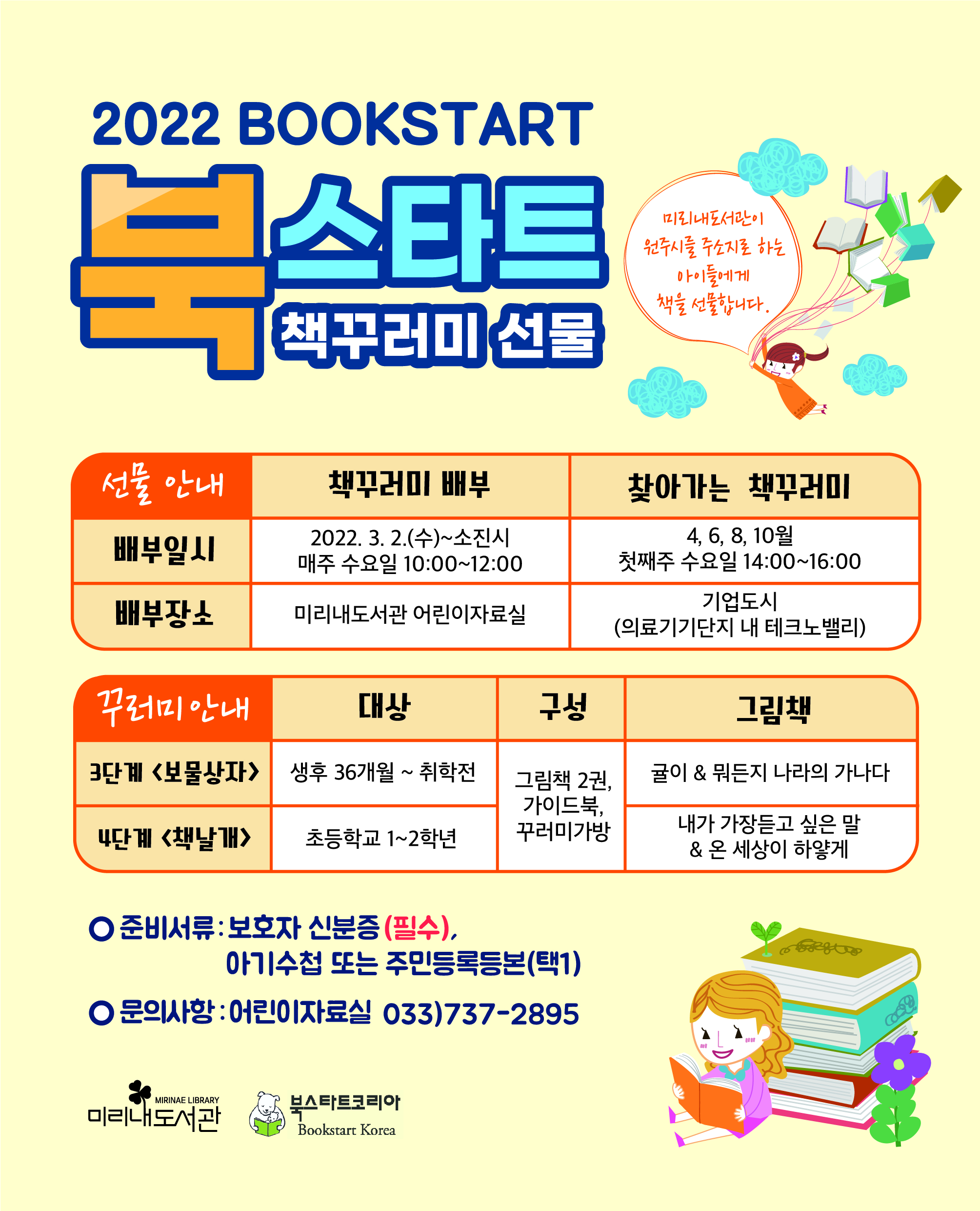 [강원사회복지신문 서은진 기자]=생후 36개월~초등학교 2학년 아동 대상 그림책과 북스타트 가이드북 제공 3월 2일부터 매주 수요일 미리내도서관에서 선착순 배부 미리내도서관은 오는 3월 2일부터 원주시 아동을 대상으로 북스타트 책 꾸러미 선물 서비스를 운영한다고 밝혔다. 북스타트란 '책과 함께 인생을 시작하자'라는...