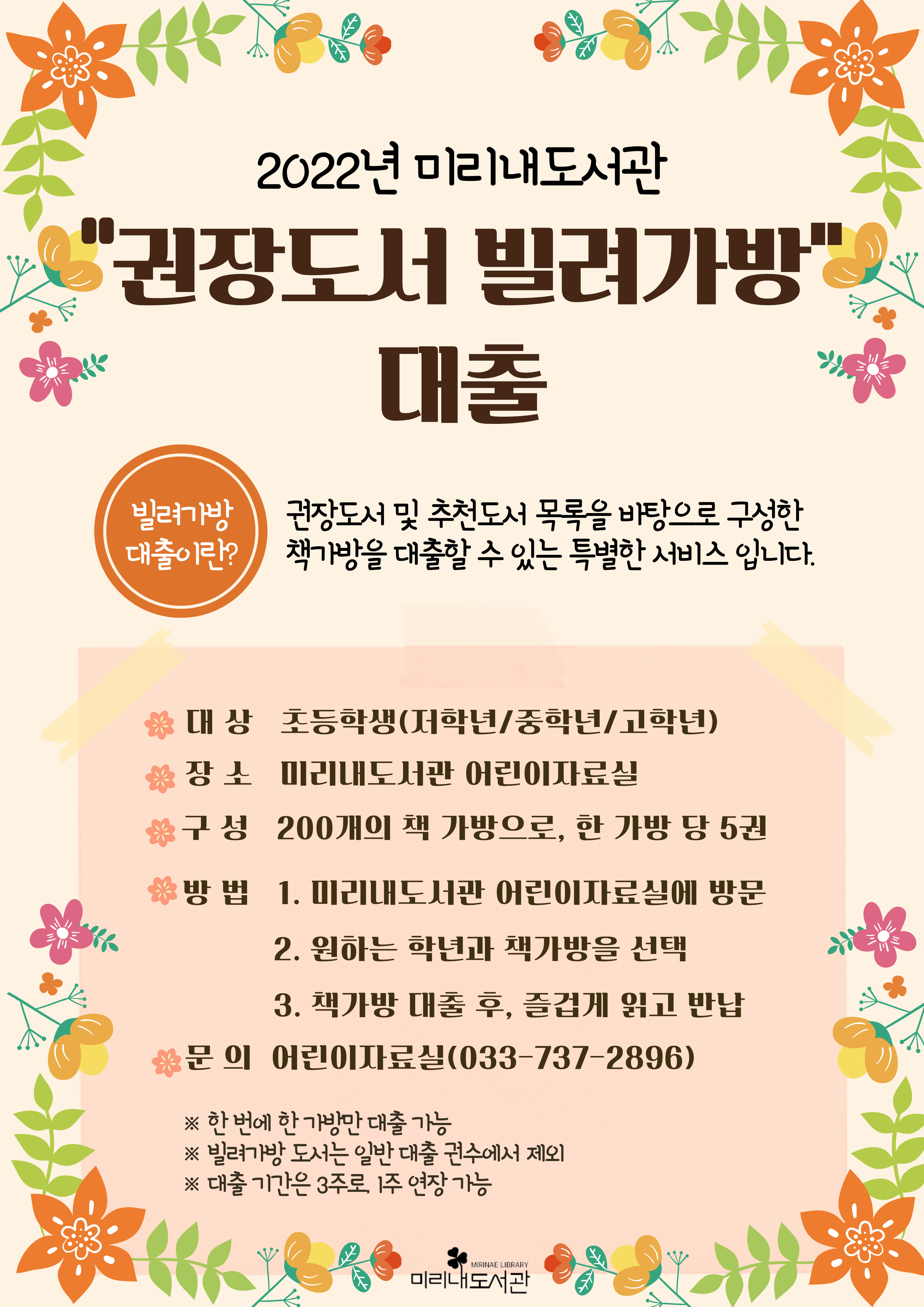 [강원사회복지신문 홍기한 기자]=초등학생 대상으로 권장·추천 도서로 구성된 책가방 대출 서비스 미리내도서관은 원주시 초등학생을 대상으로 권장 및 추천 도서를 대출해주는 2022년 ‘권장도서 빌려가방’ 서비스를 운영한다. '권장도서 빌려가방'은 초등학교와 한국학교사서협회가 권장 및 추천하는 도서를 책가방에 넣...